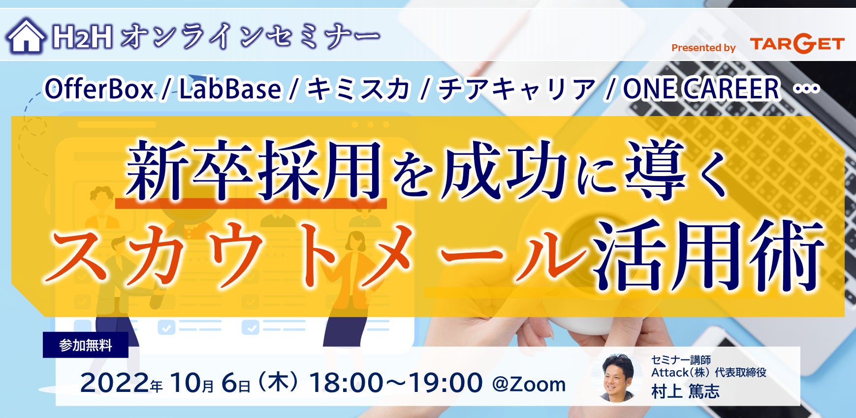 採用支援サービス『TARGET』などを展開するAttack株式会社(本社:東京都品川区、代表取締役:村上篤志)が経営者や採用責任者の方を対象とし、新卒採用におけるスカウト媒体の選定や運用方法に焦点を当てた無料オンラインセミナーを2022年10月6日(木)に開催致します。
