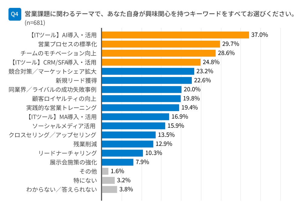 営業課題に関わるテーマにおいて興味関心のあるキーワードを聞いたところ、「【ITツール】AI導入・活用」が37.0%でトップ、「営業プロセスの標準化」が29.7%、「チームのモチベーション向上」が28.6%、「【ITツール】CRM/SFA導入・活用」が24.8%となりました。