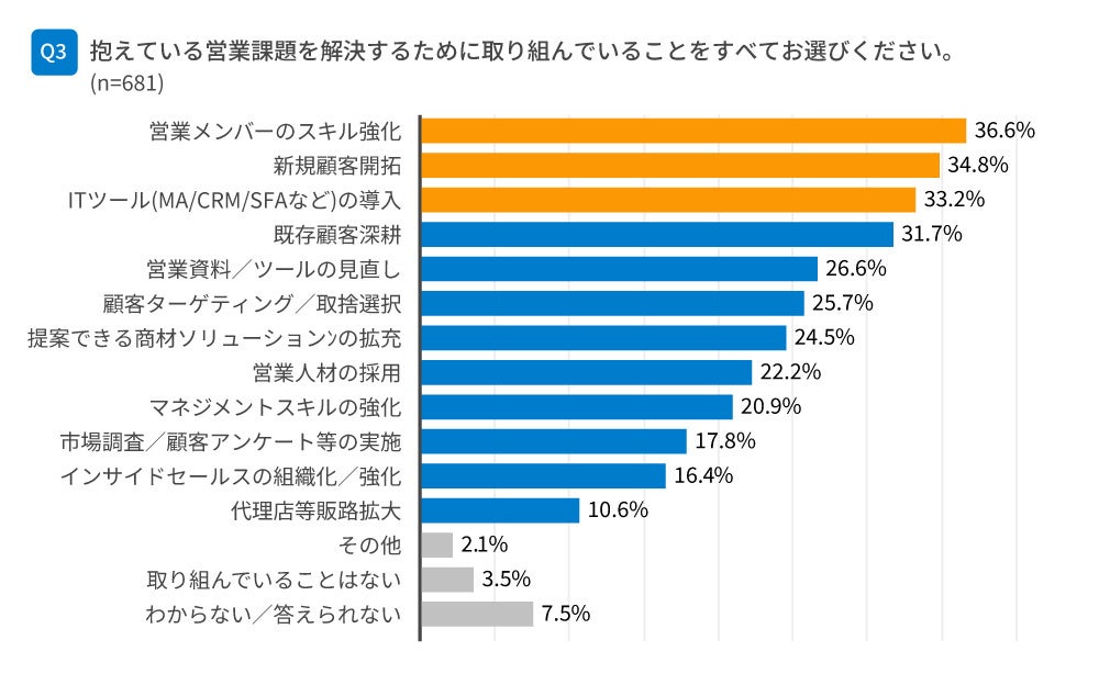 抱えている営業課題を解決するための取り組みについては、「営業メンバーのスキル強化」が36.6%で最多、次いで「新規顧客開拓」が34.8%、「ITツール(MA/CRM/SFAなど)の導入」が33.2%と続きました。