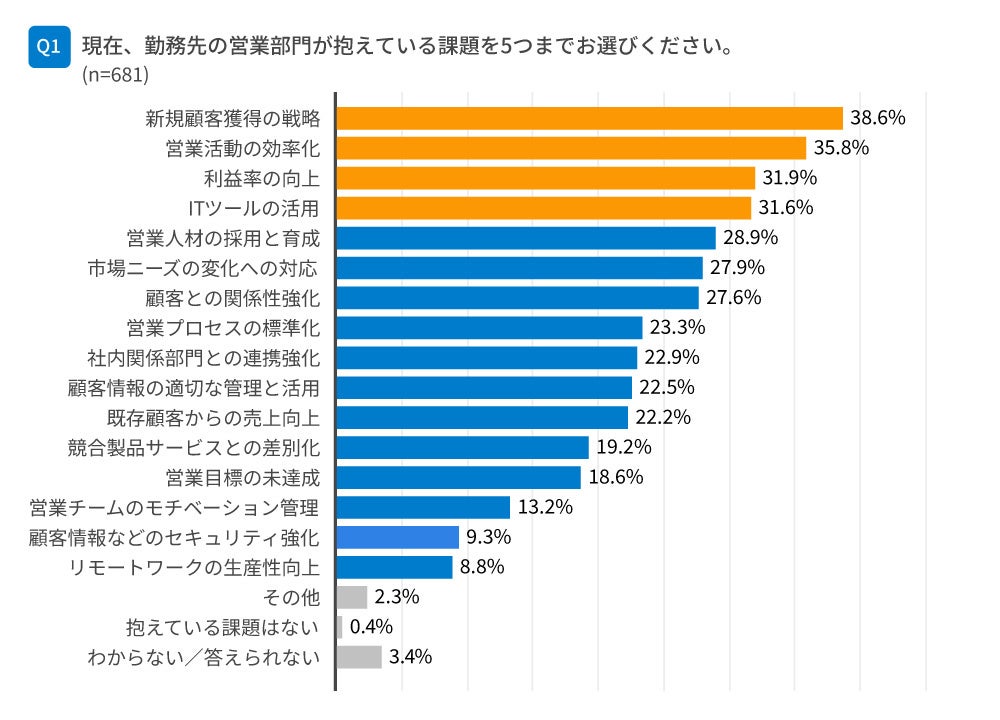 勤務先の営業部門が抱えている課題については、「新規顧客獲得の戦略」が38.6%と最も高く、「営業活動の効率化」が35.8%、「利益率の向上」が31.9%、「ITツールの活用」が31.6%と続きました。