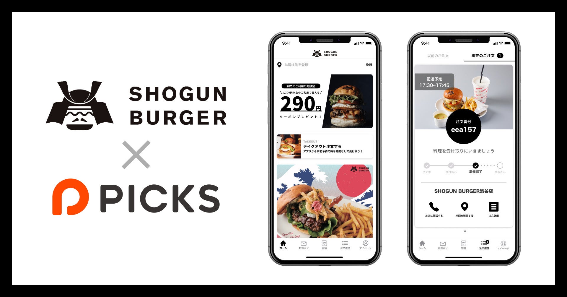 この度、こちらの2ブランドにおいて多機能なモバイルオーダーアプリがかんたんに構築できる「Picks App」を導入いただきました。お客様は多様な商品が見やすくデザインされたオリジナルのアプリから「SHOGUN BURGER」や「SHOGUN FRIED HIROO」の商品をオーダーし、待ち時間なくスムーズにテイクアウトいただけます。お客様による手数料の負担がないため、デリバリーサービスよりもリーズナブルな価格でお手軽にハンバーガーやフライドフードをお楽しみいただけます。