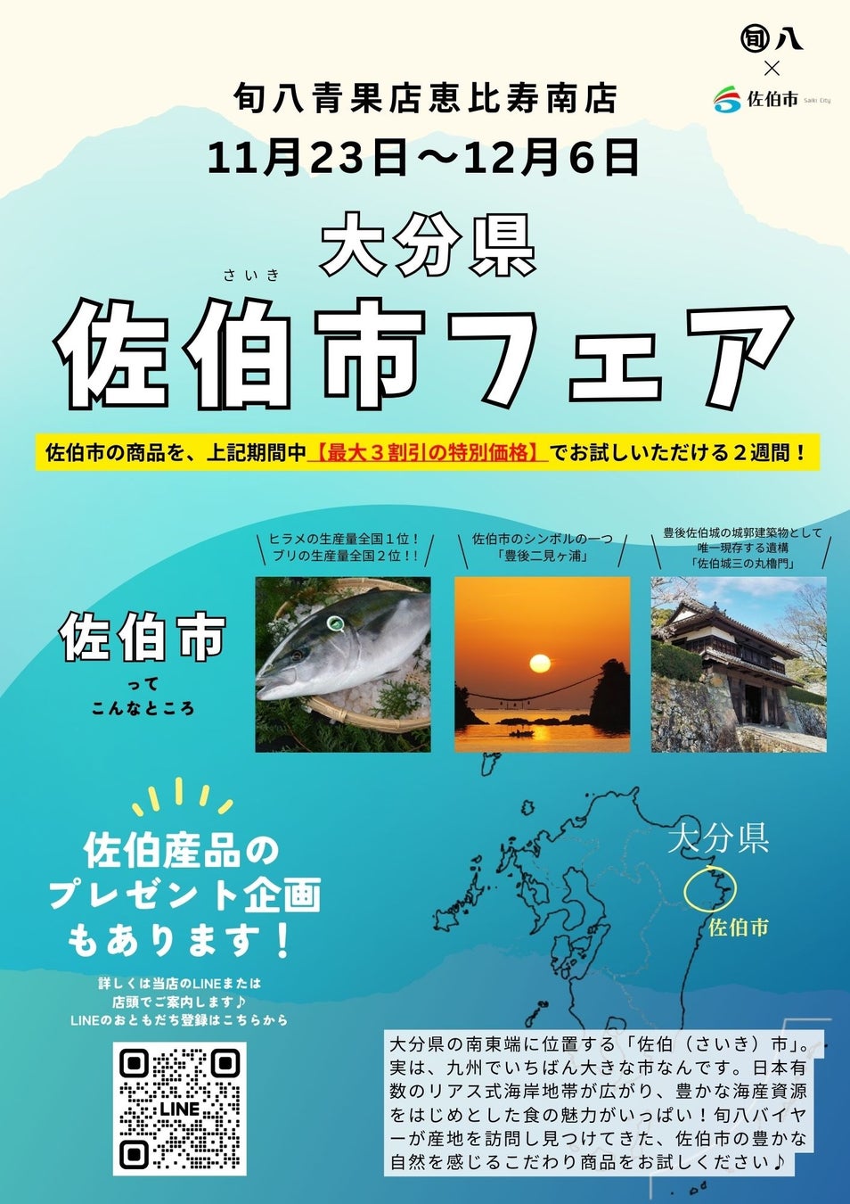 株式会社アグリゲート(東京都品川区)が運営する「旬八青果店(恵比寿南店・天王洲店)」では、11月23日から12月20日までの4週間、大分県佐伯市の産品を紹介する「佐伯市フェア」を実施いたします。東京ではなかなかお目にかかれない大分県佐伯市のこだわり商品を仕入れ、お試し価格として【最大3割引】で販売をいたします。佐伯市フェアは今年で2年目の取組みです。