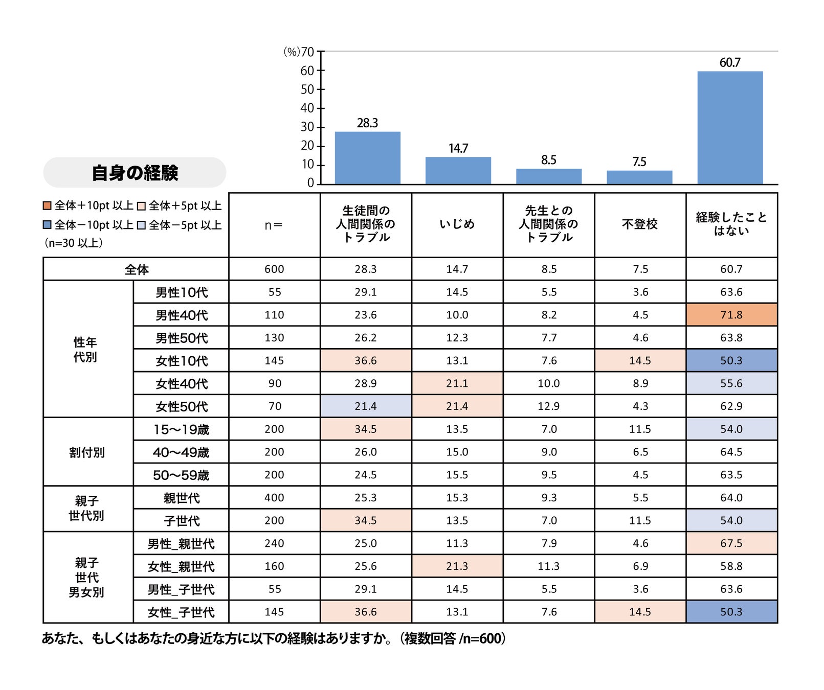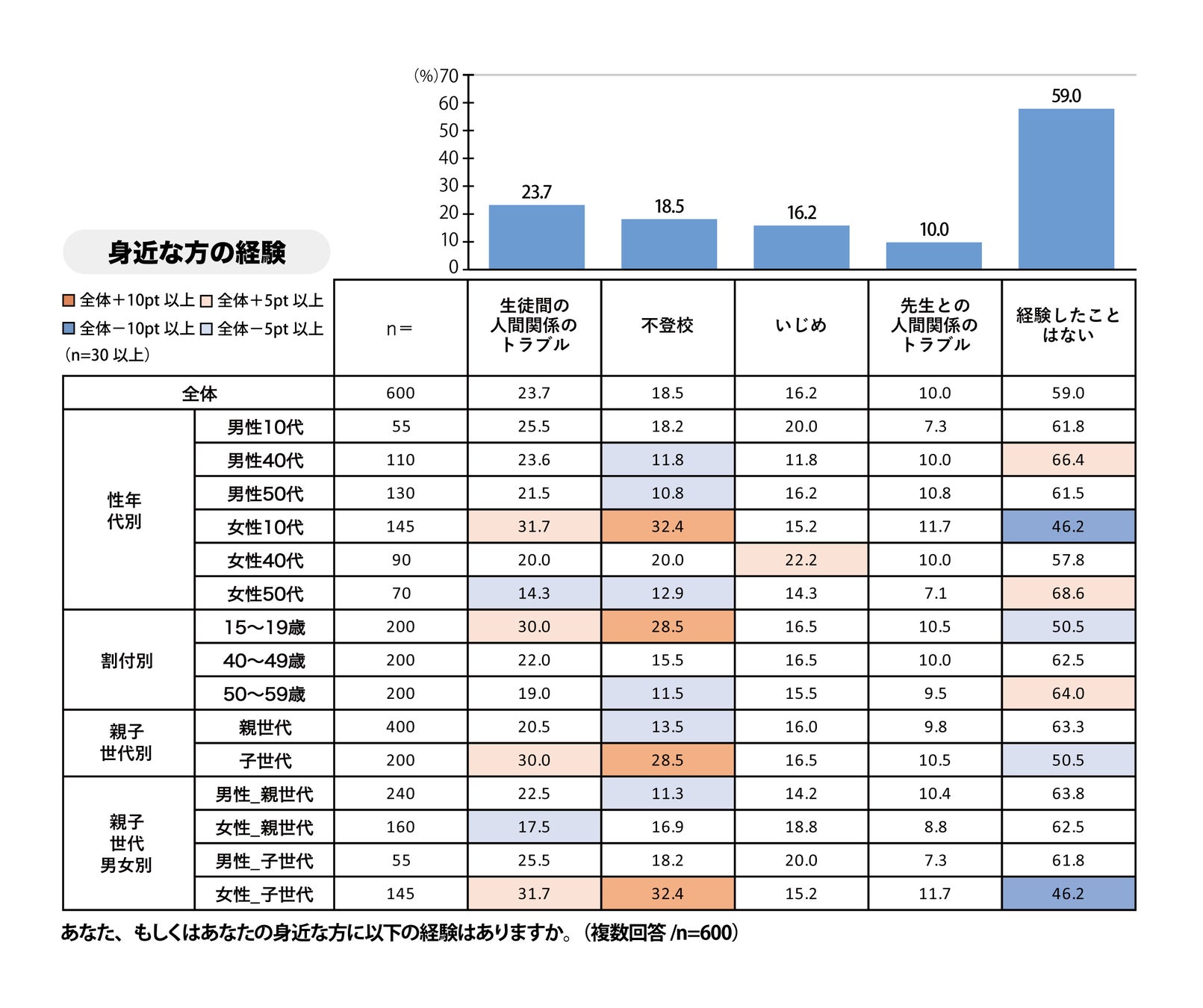 自身の経験としては「生徒間の人間関係のトラブル」が28.3%で最も高く、次いで「いじめ」が14.7%、「先生との人間関係のトラブル」が8.5%と続きました。また、身近な方の経験では「生徒間の人間関係のトラブル」が23.7%で最も高く、次いで「不登校」が18.5%、「いじめ」が16.2%となりました。