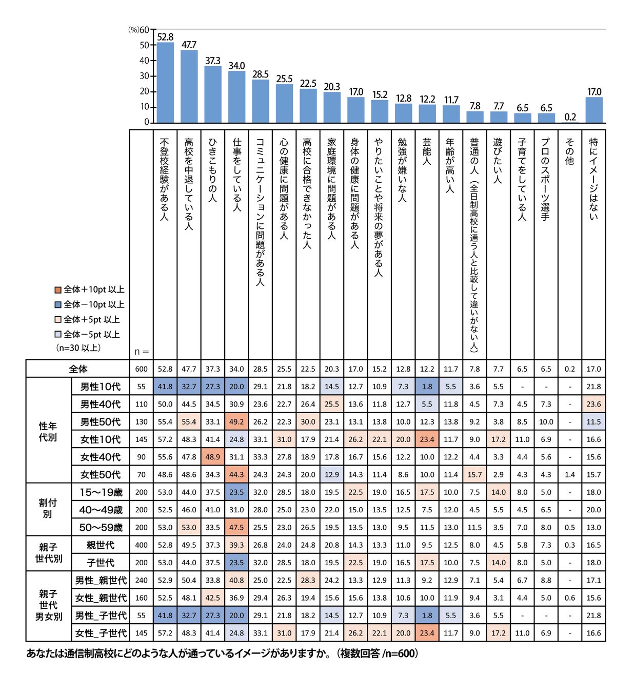 全体では、不登校経験者、高校中退者、ひきこもりの人などの回答が多く、「何かしらの原因で全日制の学校に通えなくなった人」というイメージが強いようですが、データ詳細を見ると女性10代は「将来の夢がある人」や「芸能人」の回答も多かったです。最近は、アイドルやインフルエンサーが通信制高校に在籍していることを公開するケースも増えており、不登校経験者の受け皿になっていると同時に「やりたいことがある人」も集まっているという幅広いイメージがあるようです。
