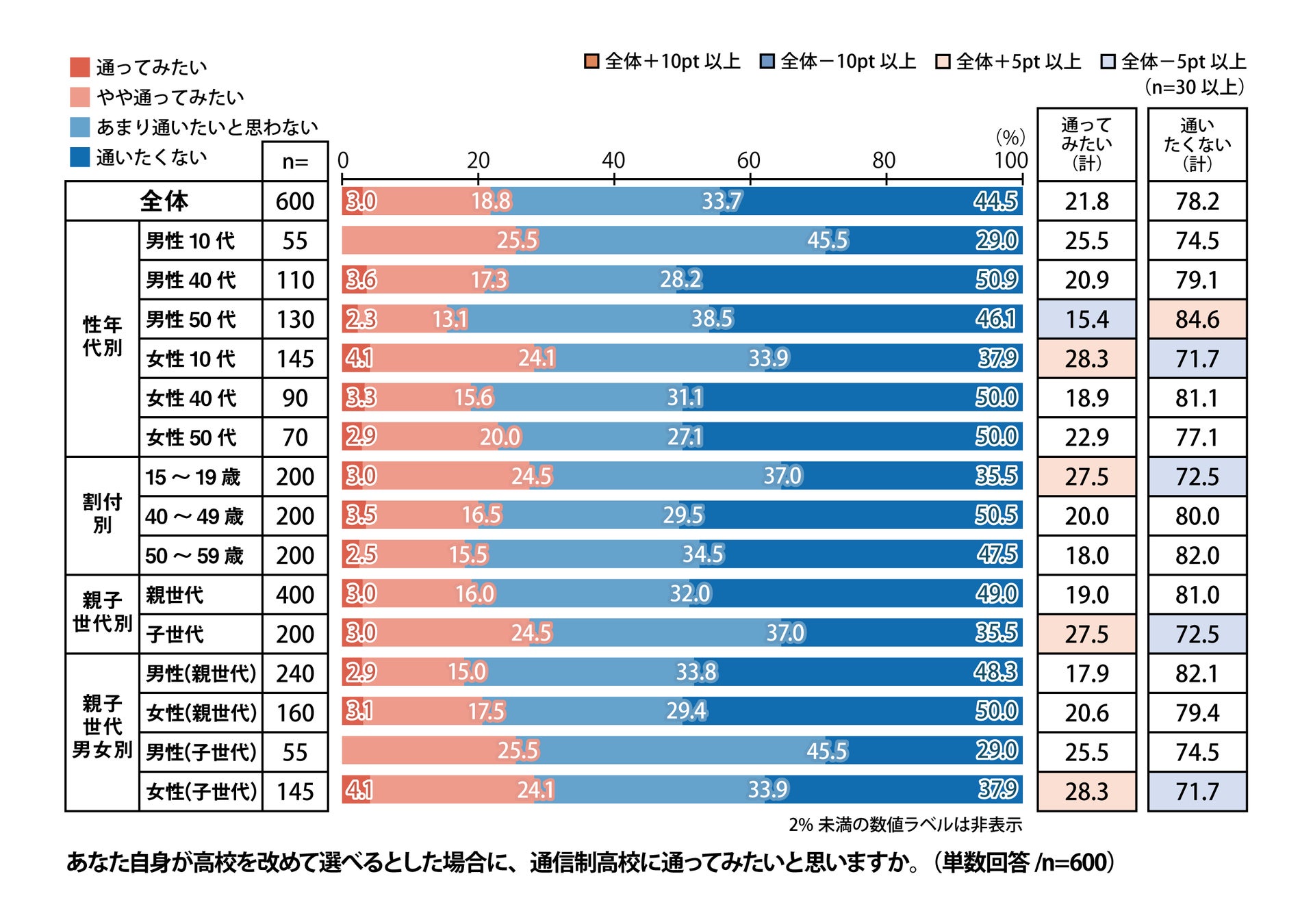 通信制高校への通学意向に関しては「通ってみたい」が3.0%、「やや通ってみたい」が18.8%で、合計は21.8%でした。通ってみたい合計値が最も高かったのは、女性10代で28.3%。この結果からも女性10代が通信制高校に良いイメージをもっていることがわかります。