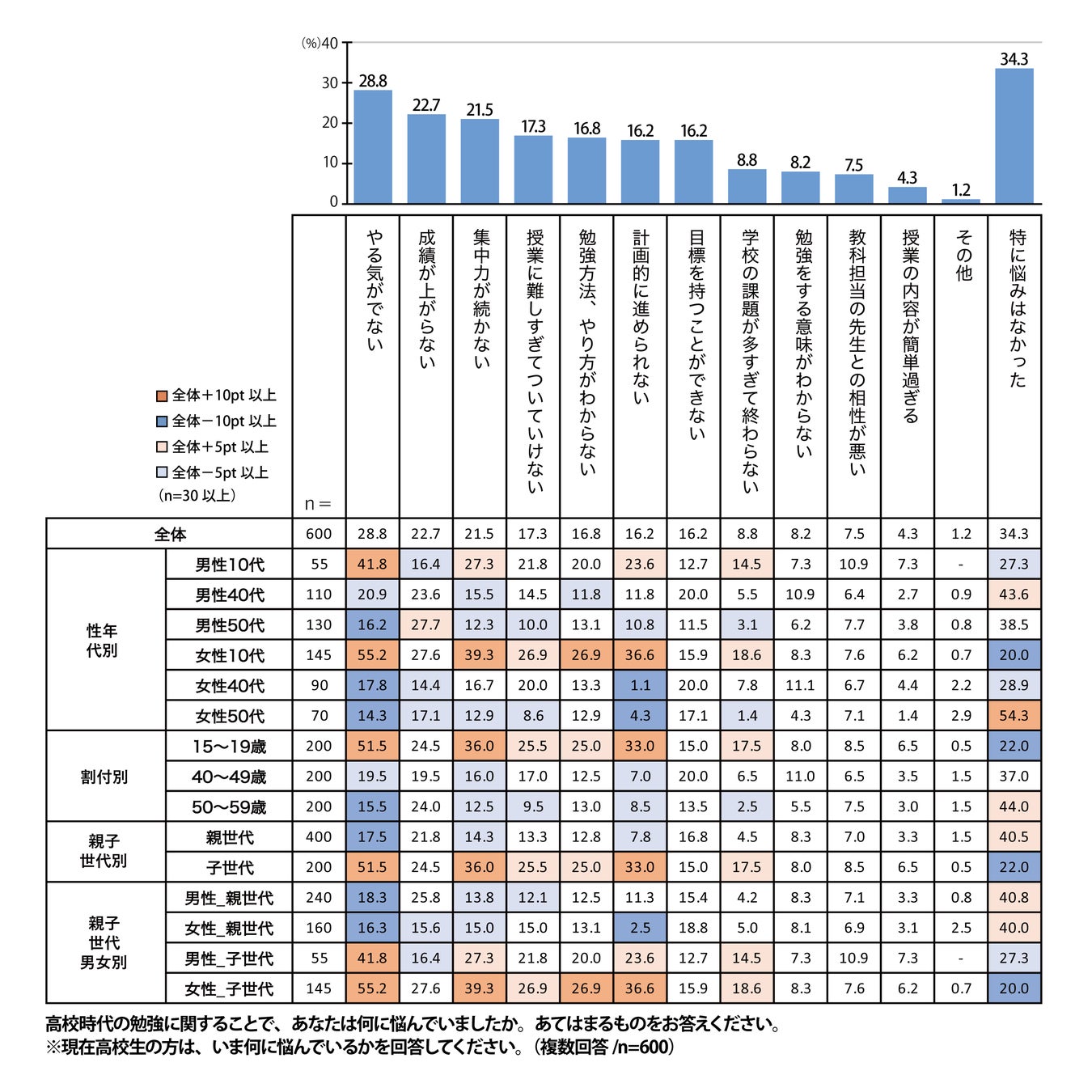 高校では勉強をしなければならないと認識していながら、親世代からも子世代からも「やる気が出ない」「モチベーションが保てない」という意見が多く寄せられました。