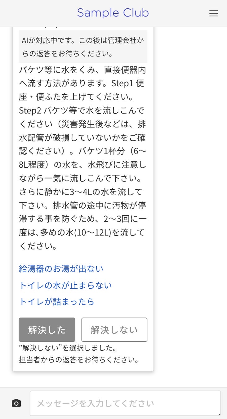・チャット画面でAIの回答に対し入居者様に解決したかどうかを確認するボタンが表示され、AIの一次回答内容を評価することが可能です。