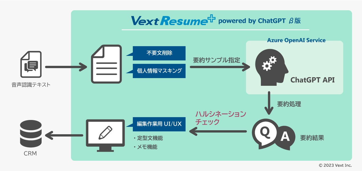 VextResumeは2011年より販売開始したベクスト独自の自然言語処理(NLP)技術で音声認識結果を自動要約し、オペレーターの応対履歴入力を支援するコンタクトセンター向けソリューションです。「VextResume+ powered by ChatGPT(β)」は近年の大きな技術ブレイクスルーにより登場したChatGPTの推論能力を活用することでテンプレート作成が不要の高精度な要約を実現し、人間工学に基づくUI/UXデザインでオペレーターのACW(アフターコールワーク)を強力に支援します。当社独自のテキストマイニング技術と分析ノウハウを活用することで生成AI特有のハルシネーション(=事実に基づかない情報)を最終応対履歴に残さない運用を可能にしています。また、音声認識テキストに含まれる個人情報は、自動マスキングを行った上でAzure OpenAI Service上のChatGPT APIへリクエストを行うことで、高セキュリティ・高可用性を実現しています。