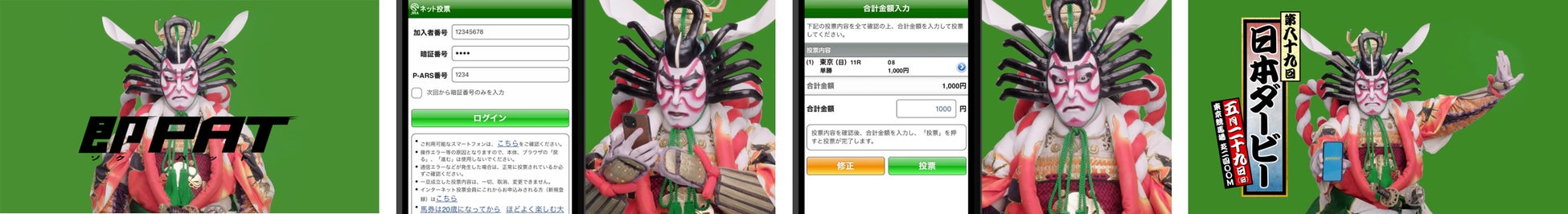 また、⽇本ダービーの魅⼒を伝える歌舞伎を取り⼊れたオリジナルムービー「競⾺祭典花姿絵(歌舞伎ダービースペシャル動画)」では、江⼾時代を舞台に尾上松也さんと尾上右近さんが兄弟役として登場。⾃宅にいながら⼆⼈が競⾺で運試しをする様⼦を描いた『おうち競⾺で候︕』篇や、インタビュー形式で休⽇の過ごし⽅を語る『ぱぱっと即PAT︕』篇など、エンタメチックに競⾺の楽しさや魅⼒を描いています。さらに、⾺の画像や、⾃分や友⼈などの顔にオリジナルの隈取を合成できるコンテンツや、⽇本ダービーの結果に応じて賞品が当たるTwitterキャンペーンなども実施いたします。ぜひお楽しみください︕