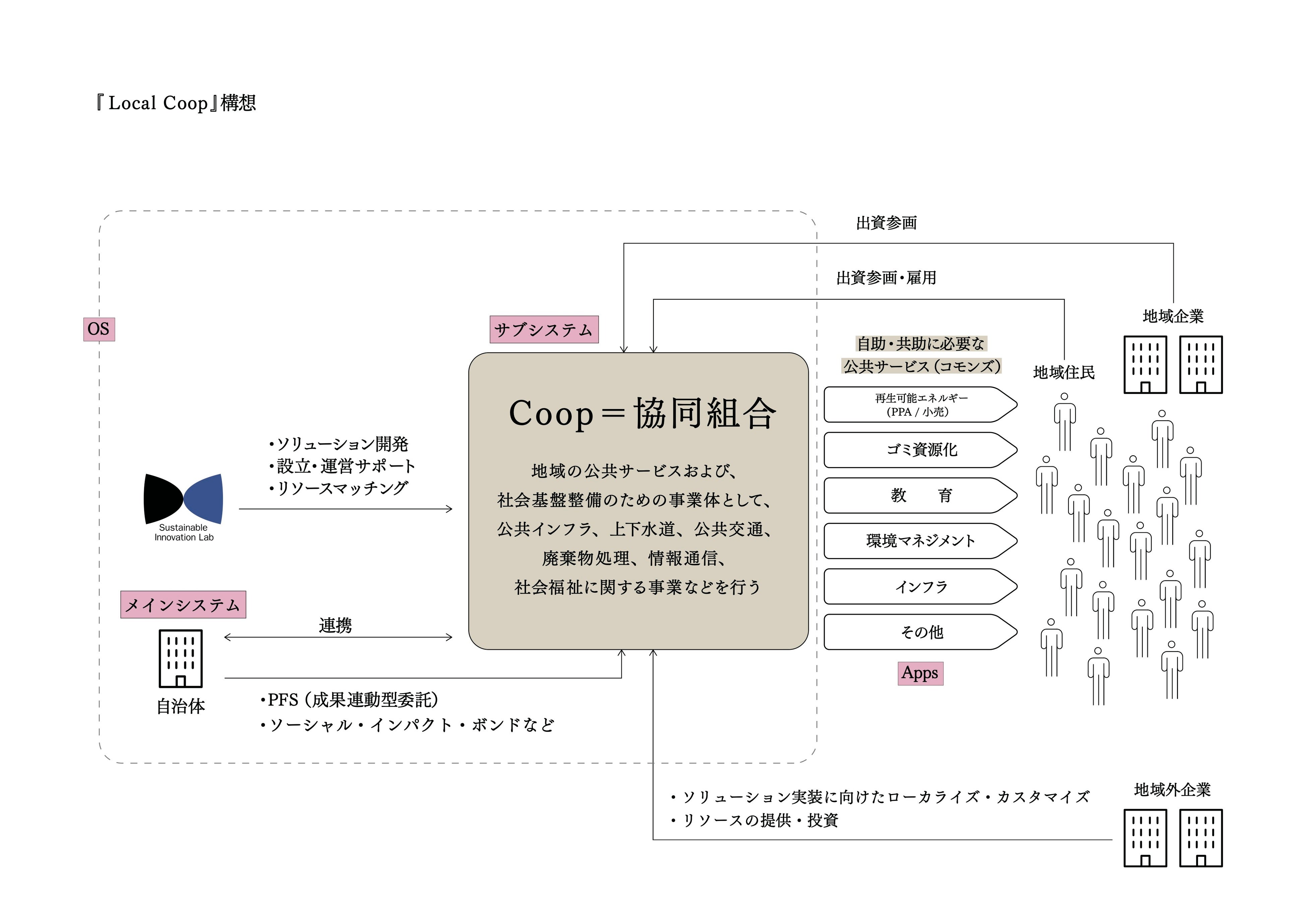 「Coop」という単語が示す通り、協同組合のかたちを住民参画で構築していきます。住民自身が出資参画し、意思決定をし、労働する、まさに地域経営を担う協同組合として、自治体や企業と協働しながら、自らの地域の豊さと持続性をデザインしていくことを想定しています。