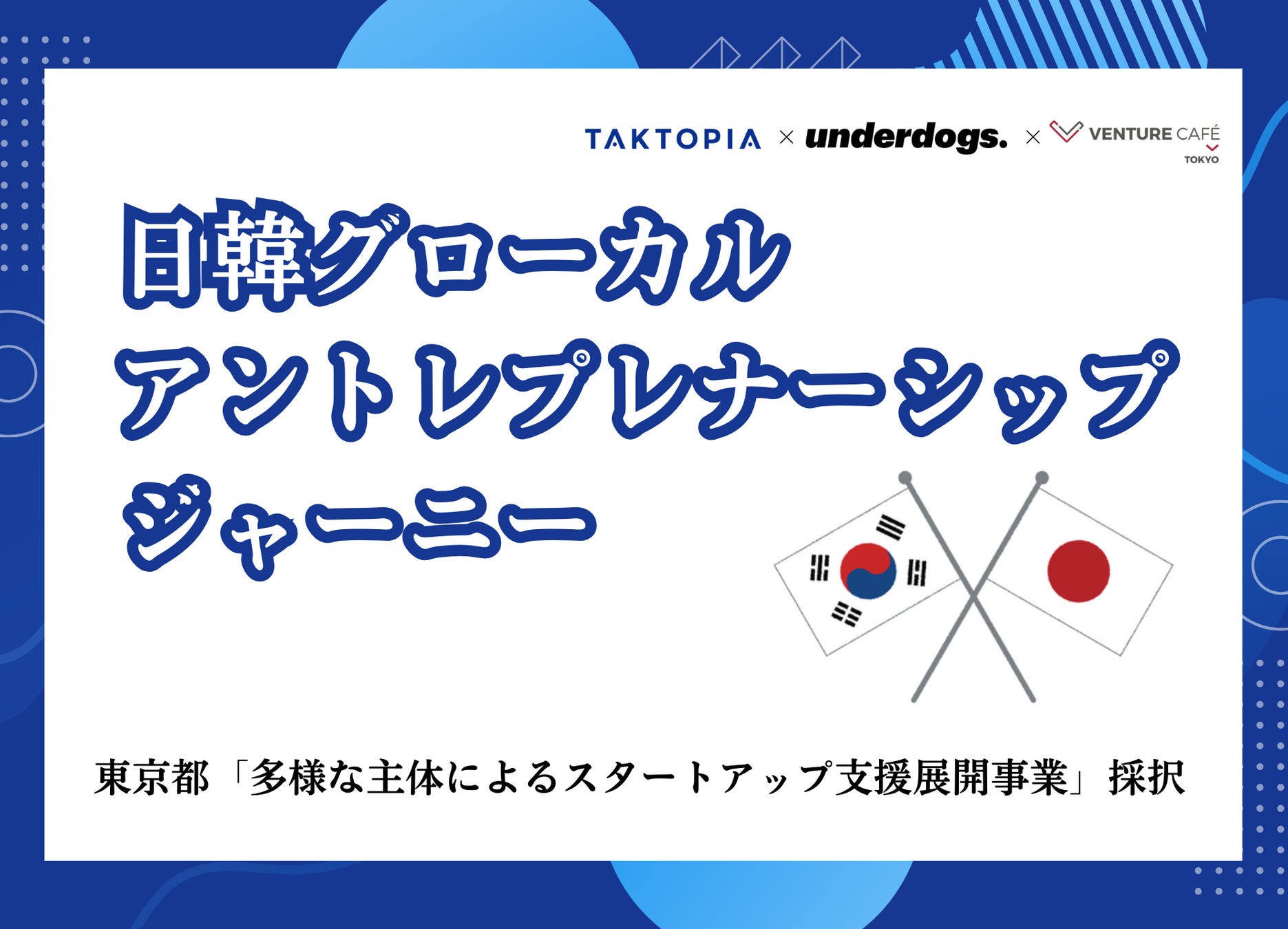 タクトピア株式会社(本社:東京都千代田区、代表取締役:長井悠、以下タクトピア)は、2024年度東京都が主催する「多様な主体によるスタートアップ支援展開事業(TOKYO SUTEAM)」に採択されたことをご報告いたします。本プログラム「日韓グローカル・アントレプレナーシップ・ジャーニー」では、「Underdogs.(韓国を拠点にスタートアップ支援や起業家教育を展開する教育ベンチャー企業)」、「Venture Café Tokyo(『Connecting innovators to make things happen』をミッションに掲げ、魅力的な空間、プログラム、物語の提供を通じて、イノベーター同士を結び付けることで、イノベーション・エコシステムの発展を目指すNPO法人)」とタッグを組み、文化的な違いと共通点が共存する日本・韓国の学生を対象に、グローバルとローカルの視点を融合した起業家精神の育成を目指し、今後の人口減少社会を担う若者を対象に意識変容・行動変容を促し、アントレプレナーシップの裾野拡大をおこなうことを目指します。