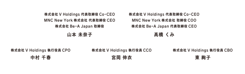 MNC New York株式会社(本社:東京都渋谷区神宮前、代表取締役CEO:山本 未奈子、以下「MNC New York」)と、株式会社Be-A Japan(本社:東京都渋谷区神宮前、代表取締役CEO:髙橋 くみ、取締役:山本 未奈子、以下「Be-A Japan」)はグループ経営体制へと移行し、新たにホールディングスカンパニー 株式会社V Holdings(本社:東京都渋谷区神宮前、代表取締役 Co-CEO:山本 未奈子、代表取締役 Co-CEO:髙橋 くみ)を設立いたしましたことをご報告いたします。
