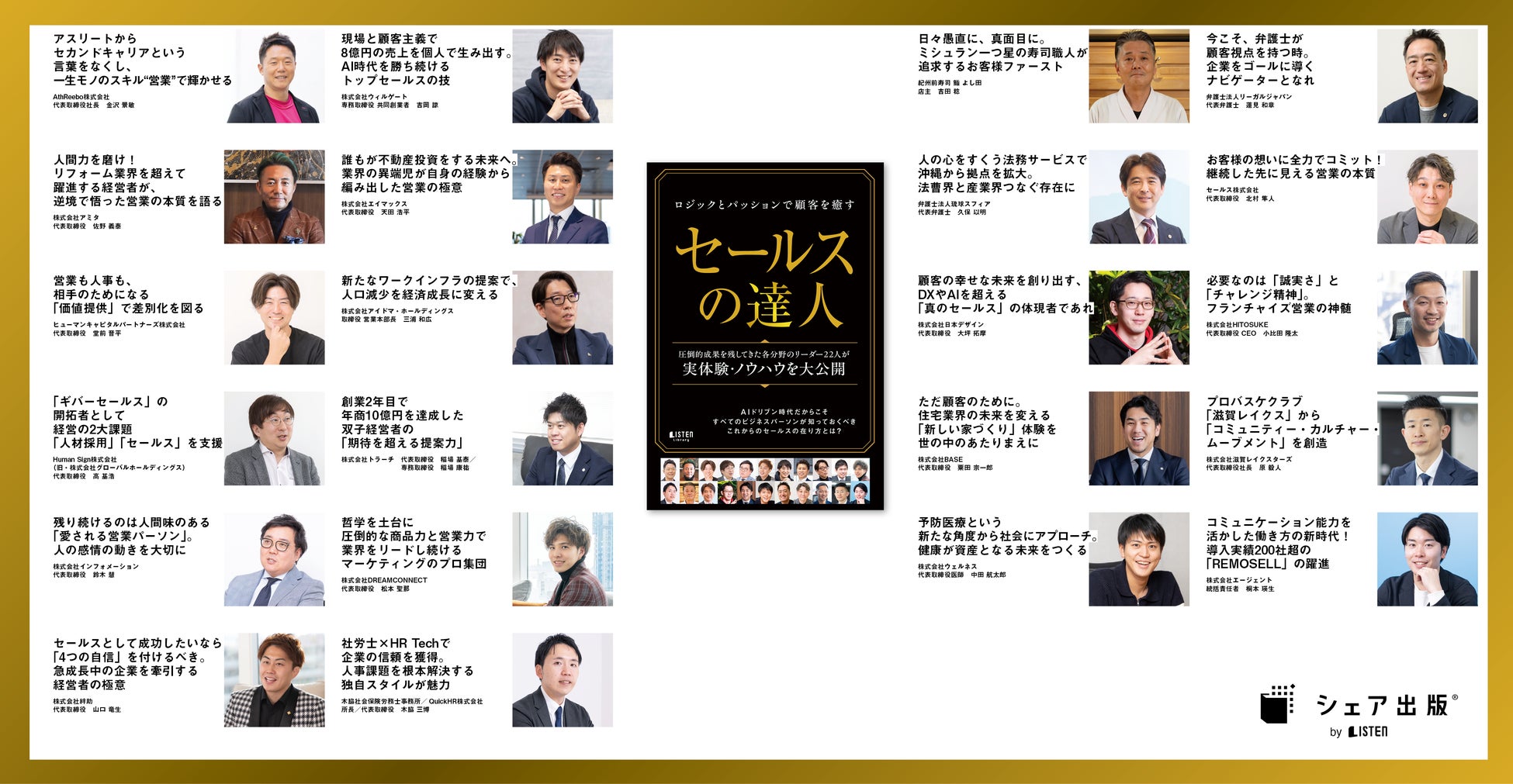 経営者を中心に累計3,000名以上へインタビューを行い、書籍出版やウェブメディア運営を手がけるリスナーズ株式会社(東京都新宿区、代表者:垣畑 光哉、以下「当社」)は、書籍「ロジックとパッションで顧客を癒す『セールスの達人』」をAmazon.co.jpより5月1日(木)に出版します。