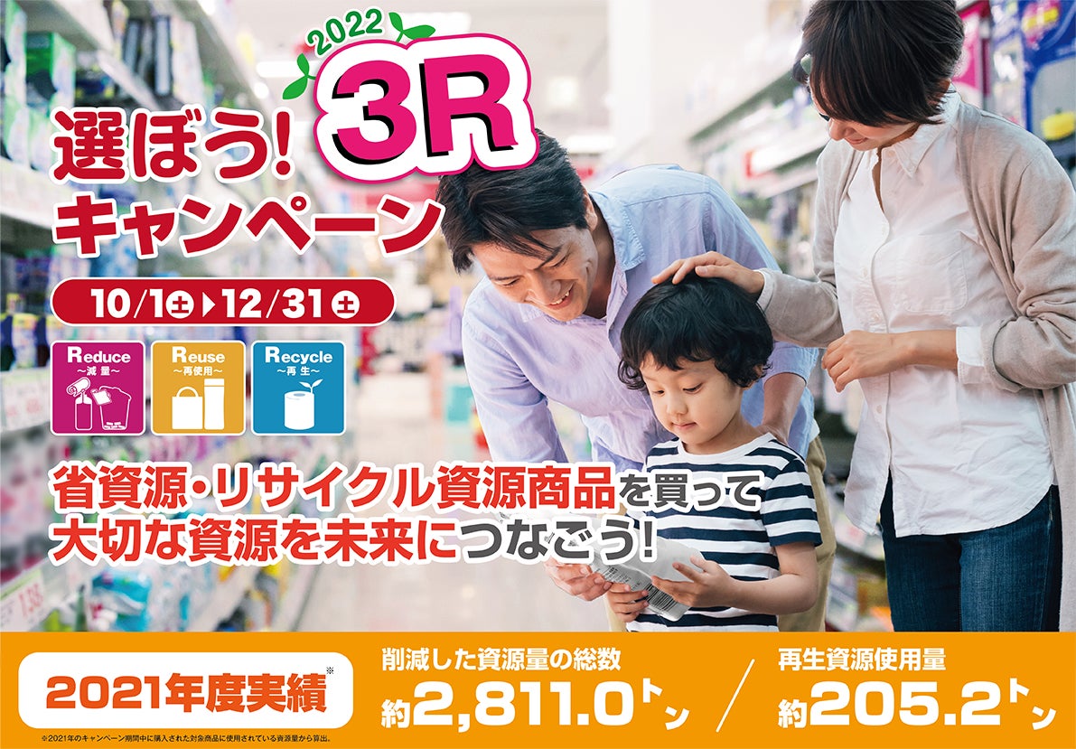 2017年から開始し6年目となる今年のキャンペーンは、「リデュース」につながる省資源商品や「リサイクル」等に関連した商品がキャンペーンの対象となっています。今年の『選ぼう!3Rキャンペーン」では、参加メーカーや実施店舗など、昨年よりスケールアップして、10月1日(土)から、全国のスーパー、ドラッグストア等、およそ19,000店舗でスタートします。