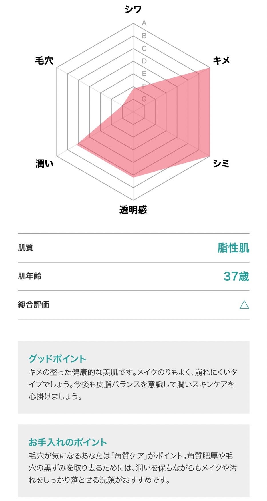 自身の顔をカメラで読み込むと、AI肌診断によって肌の状態(シワ、キメ、シミ、透明感、うるおい、毛穴、肌質、肌年齢)の8項目で測定・評価。