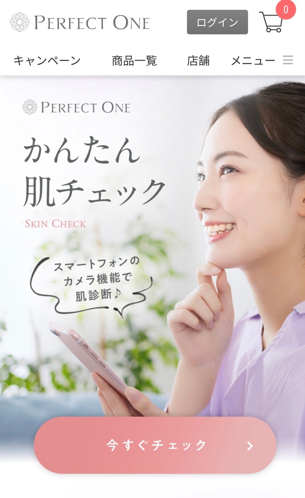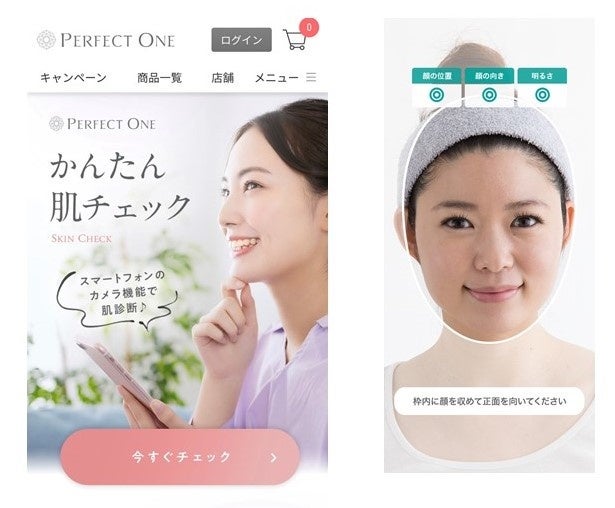 「パーフェクトワン」公式アプリの肌診断でスマートフォンから顔写真を撮影すると、肌の状態をシワ、キメ、シミ、透明感、うるおい、毛穴、肌質、肌年齢の8項目で測定・評価。診断結果をもとに、自分のお肌と相性の良い「パーフェクトワン」シリーズの商品がおすすめされます。