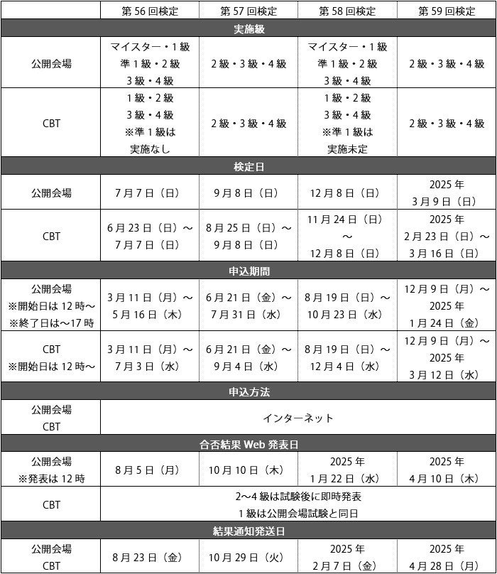 ※各検定回の実施級は別紙1をご覧ください。なお、マイスターは東京23区、名古屋、大阪北のみの実施です。