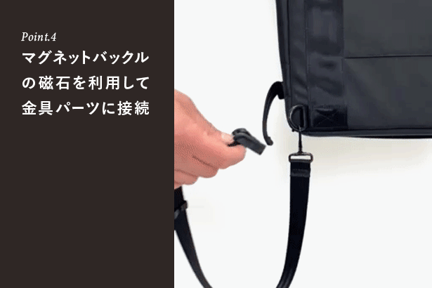 お客様からのお声を反映し、パーツを金属製にすることで磁力でパーツとマグネットバックルが接続できるようになり、使いづらさを改善しました!