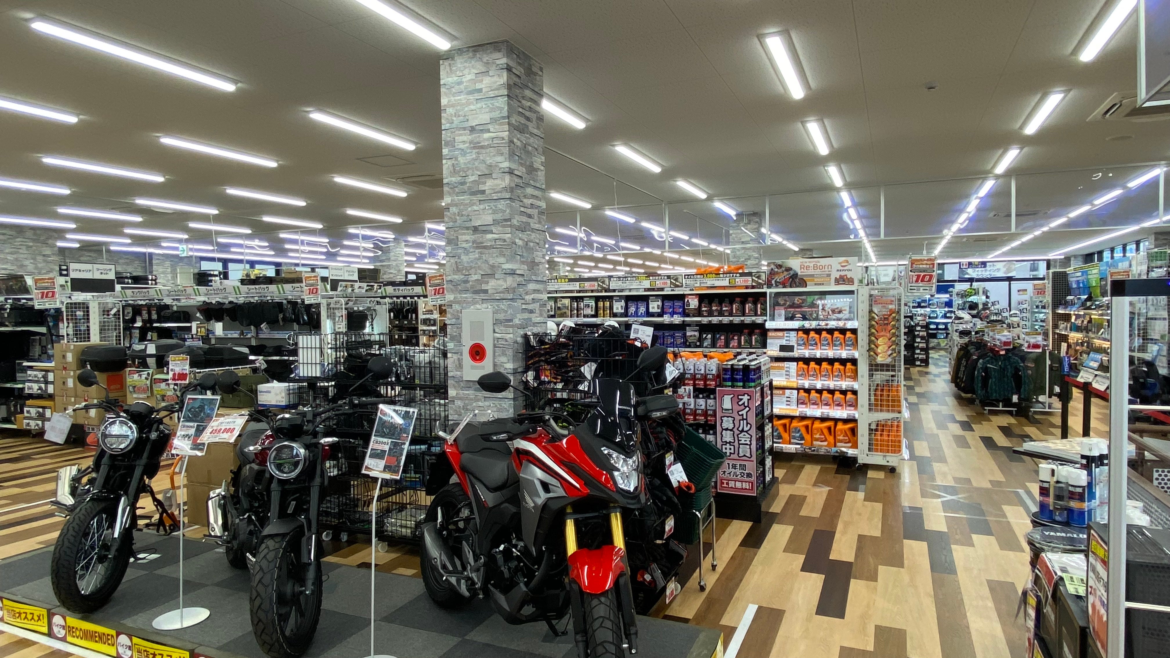 充実の品揃えと売場構成 約180坪の面積を誇る店内には、ヘルメット、ライディングウェア、グローブなどのライディングウエアから、タイヤ、オイル、バッテリーといった消耗品まで幅広く取り揃えています 。初心者からベテラン、通勤・通学ユーザーまで、用途に応じた商品選びがしやすい売場を展開します 。