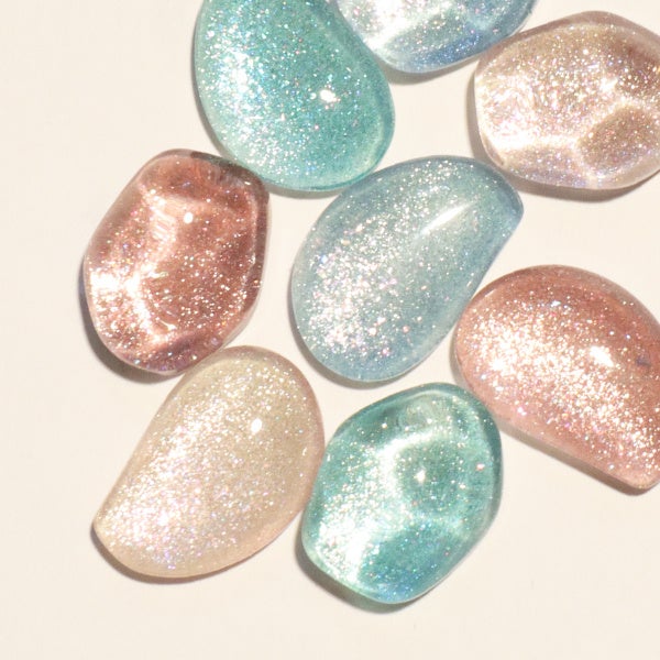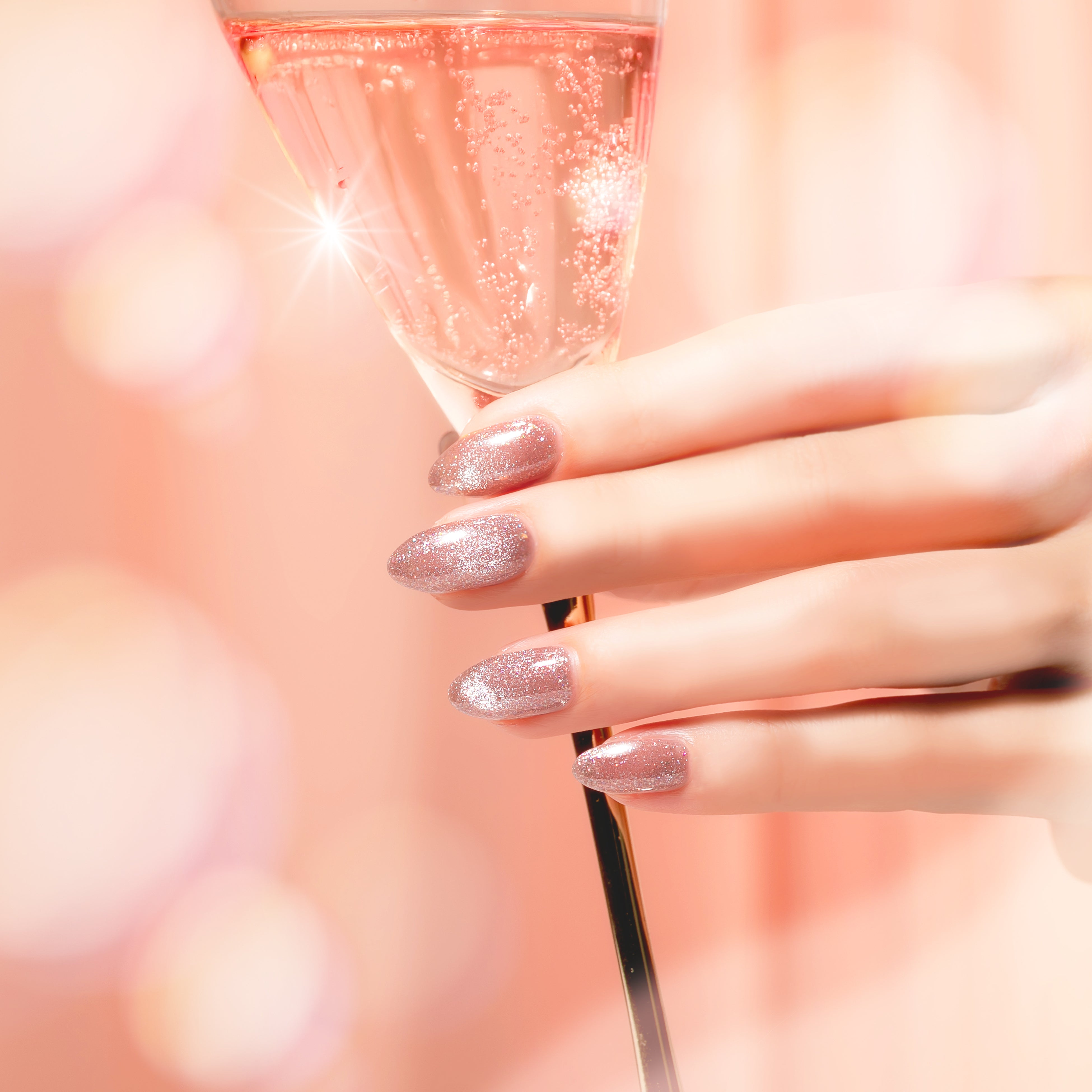 くすみピンクに小さくきらめくホロラメが、恋の予感のようにふわりと弾ける。炭酸の泡がそっと肌に触れるような、淡く甘いときめきを指先に。