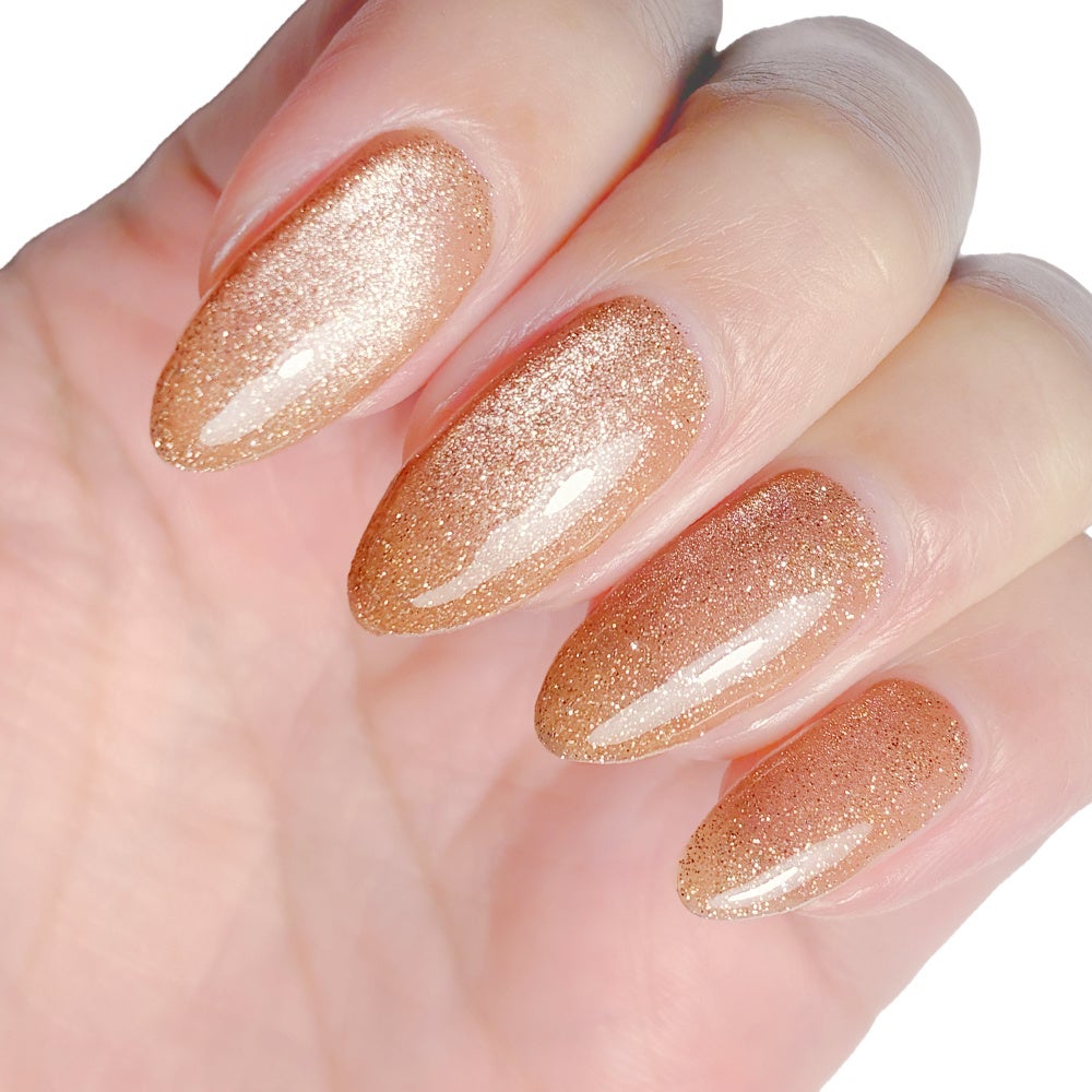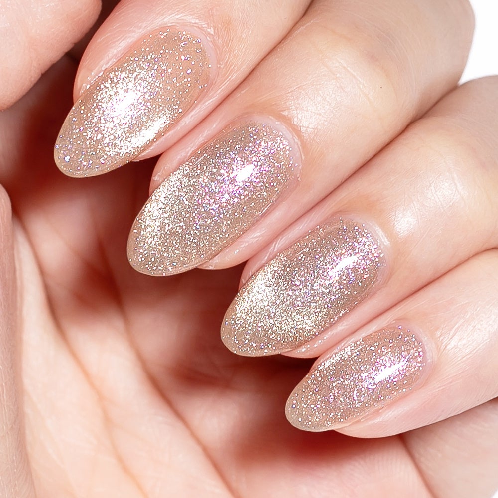 お砂糖をひと振りしたようにやわらかく輝くベージュに、ピンクのラメがそっときらめく。まるでシュガーグレーズを纏ったような、甘く上品な指先に。