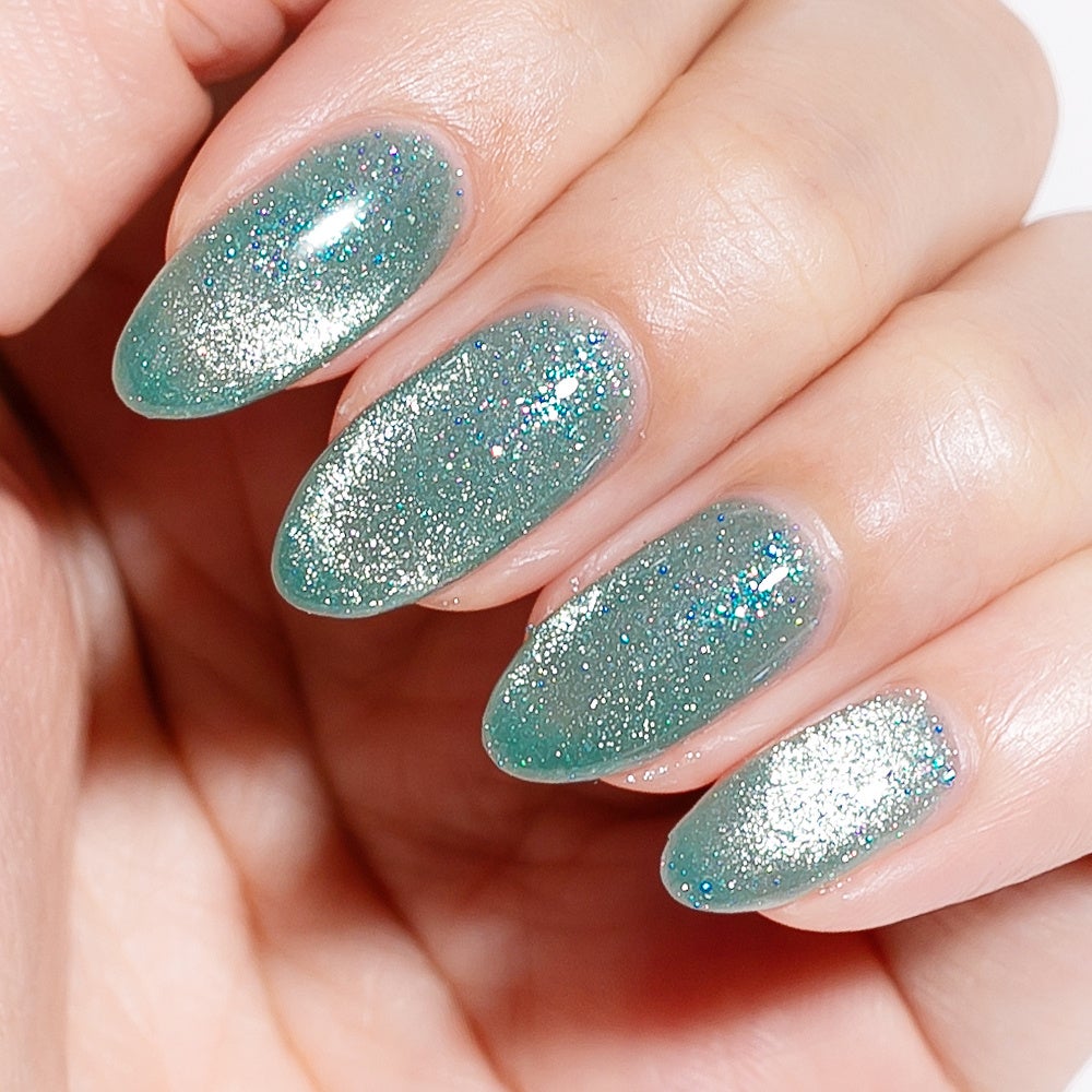 やわらかなミントカラーに、涼しげなブルーラメがとろけるように輝く。指先にのせるだけで、ひんやりとした透明感が広がるようなカラー。