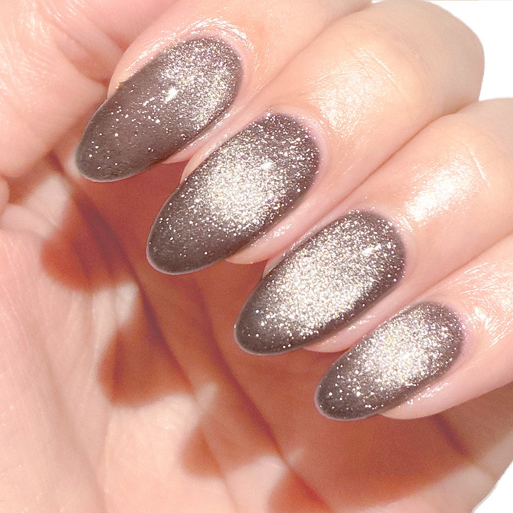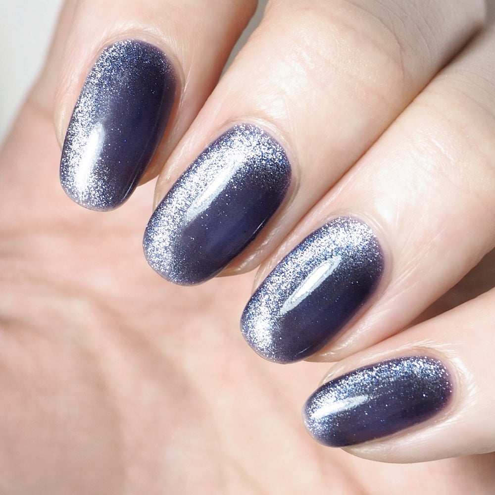 夕闇に輝き始める星屑のように、バイオレットネイビーの深みにシルバーマグネットラメが強いきらめきを放ちます。