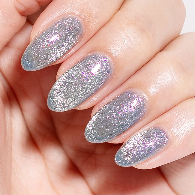 透明感のあるブルーに、パープルとブルーのラメが揺らめく。真昼の太陽を映した水面のように、澄んだ光と清涼感を纏うカラー。