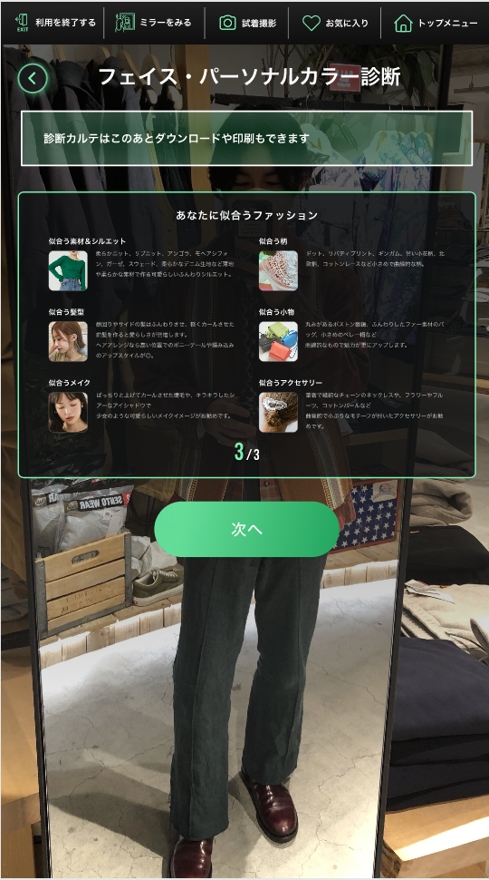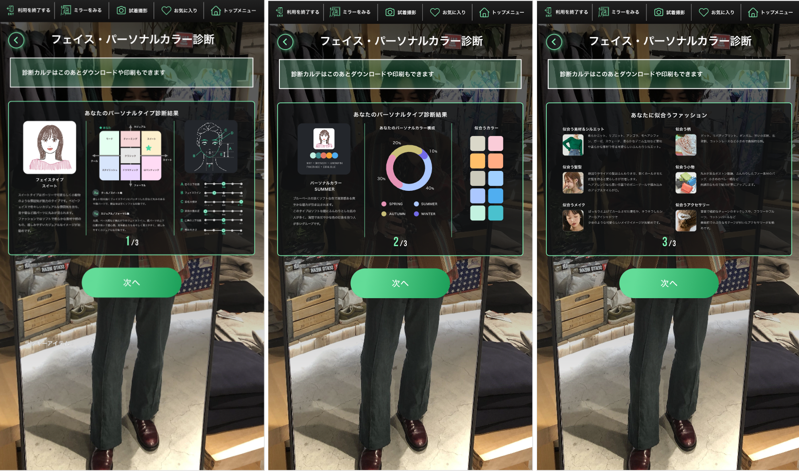 「+PLUS MIRROR」は上記以外にも、ミラー上に表示されるスナップからお好みの画像を選択いただくことでおすすめスタイリングを提案するファッション診断、お客様の12星座や直感的に選んだ色に基づいてスタイリングを提案するマインド診断など、多様なコンテンツが搭載されています。