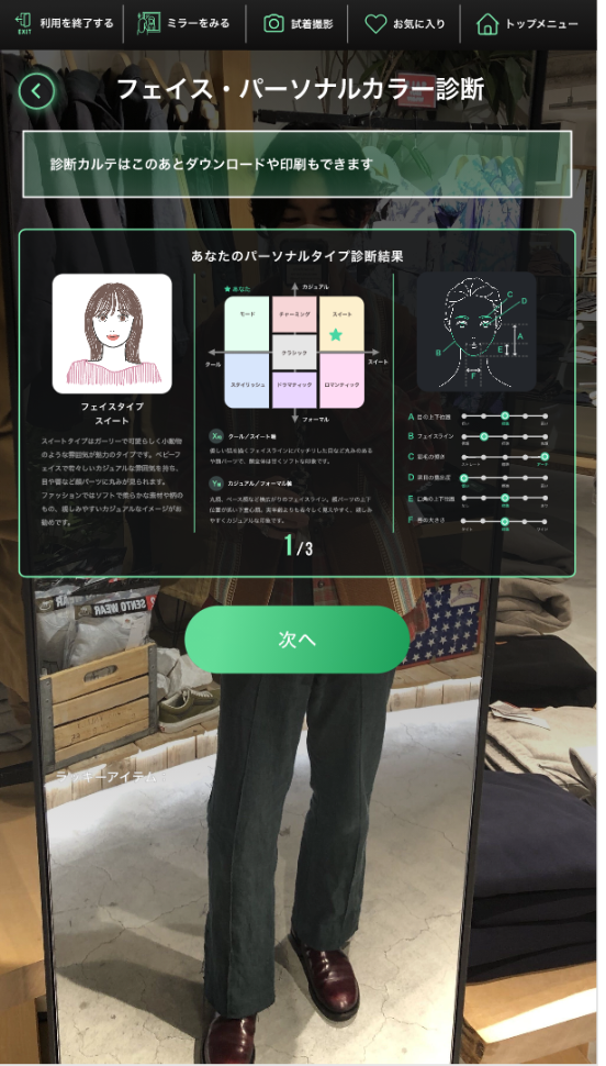 加えて、ただ店舗にて楽しんでいただくだけではなく、来店時にミラーを通して取得したお客様の好みや身体特徴のデータを蓄積し、次回以降の来店時や、来店のない期間のアプリやEC上での最適なコミュニケーションに役立てることもできます。