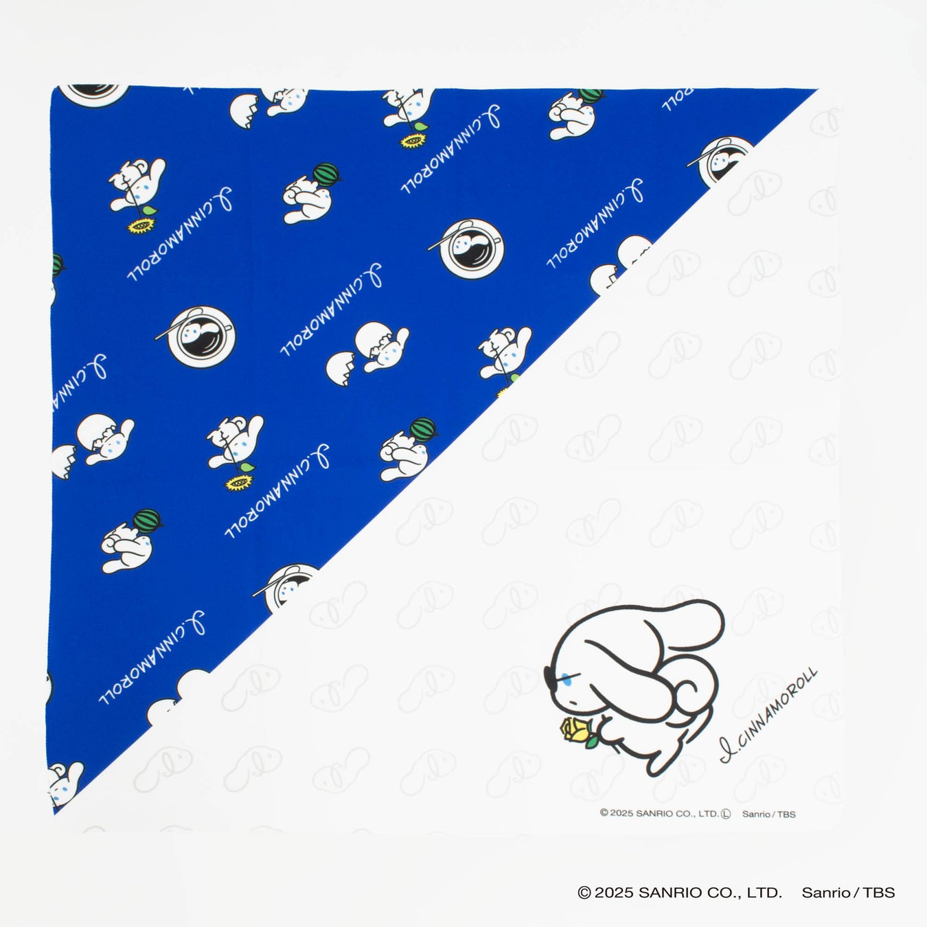もうひとつの「バンダナ・シナモンでいっぱい」は青が基調になっており、サングラスをかけて黄色いバラをもったシナモンが特徴的です。バンダナの青地の部分には、コーヒーをのぞき込んだりヒマワリを持ったりするシナモンが散らばるように配置されたデザインとなっています。綺麗な青がアクセントになったこのバンダナは白いカバンと相性ピッタリ。持ち手に細く巻き付けて、ワンポイントにしてみてはいかがでしょうか。価格は各2,200円(税込)。