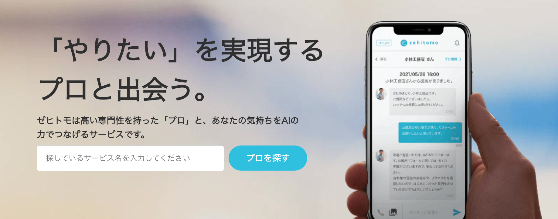 Zehitomoは、仕事をお願いしたい依頼者と、カメラマン、ヨガ講師、リフォームや工事事業者など様々な「プロ」をつなぐプラットフォームです。依頼者には、毎日の生活をサポートするものから今まで利用しようと考えたことがないような便利なサービスまで提供し、またプロには仕事の幅や可能性を広げ、日本のローカルサービス、そして働き方を変えていきます。