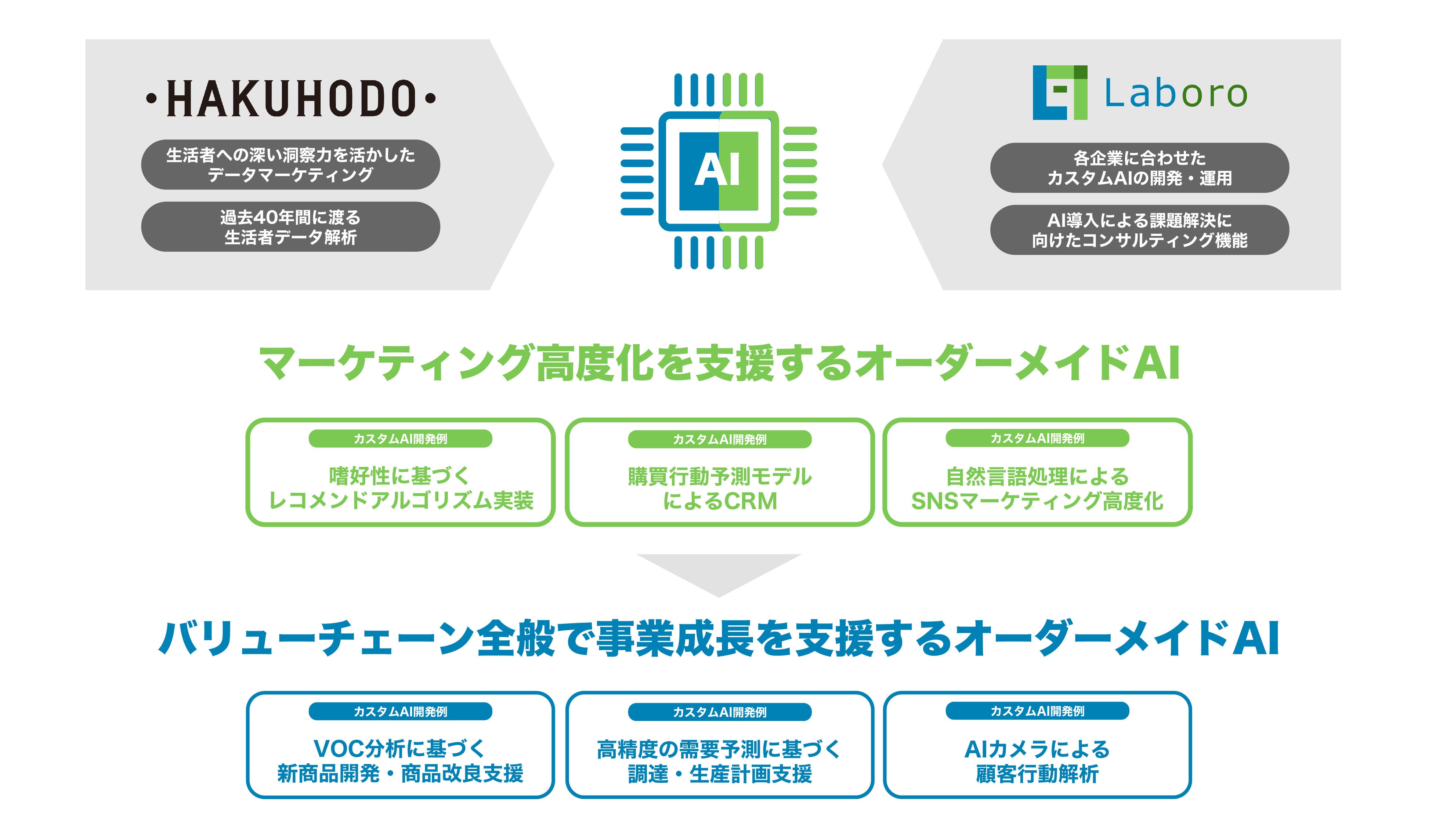 オーダーメイドによるAI・人工知能ソリューション『カスタムAI』の開発・提供およびコンサルティング事業を展開する株式会社Laboro.AI(東京都中央区、代表取締役CEO 椎橋徹夫・代表取締役COO兼CTO 藤原弘将。以下、当社)は、この度、株式会社博報堂(東京都港区、代表取締役社長 水島正幸。以下、博報堂)を引受先とする第三者割当増資による資本業務提携契約を締結したことをお知らせいたします。