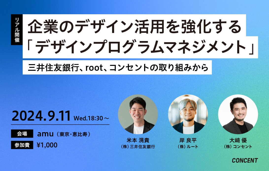 株式会社コンセント(本社:東京都渋谷区 代表:長谷川敦士 以下、コンセント)は、企業のデザイン活用を強化する「デザインプログラムマネジメント(DPM)」をテーマにしたセミナーを、2024年9月11日(水)に恵比寿で開催します。株式会社三井住友銀行(以下、三井住友銀行)、株式会社ルート(以下、root)から、デザインプログラムマネジメントの実務で活躍するゲストスピーカーをお迎えし、各社におけるDPMの取り組みをご紹介いただきながら、その意義などについてディスカッションします。