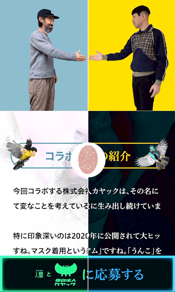 人間さんと一緒に採用ができるなんて、ありがたい限りです。去年の「爆音コンビニ」みたいな広告なのに、エンタメとしても成立しているコンテンツを作っていることがすごい。とはいえ、こういう面白い採用自体、僕らは13年前から始めていて、「エゴサーチ採用」や「いちゲー採用」など、すでに何度もバズる採用をやっています。人間は僕らの後追いと言っても過言じゃないですよね。ぜひ、面白法人カヤックにご応募ください。