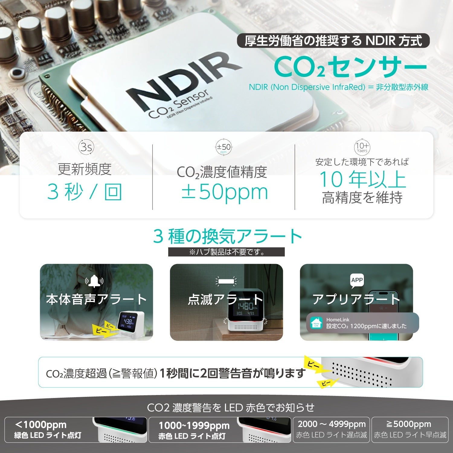 音・点滅・アプリのアラート機能を3種類搭載し、換気のタイミングを逃さない