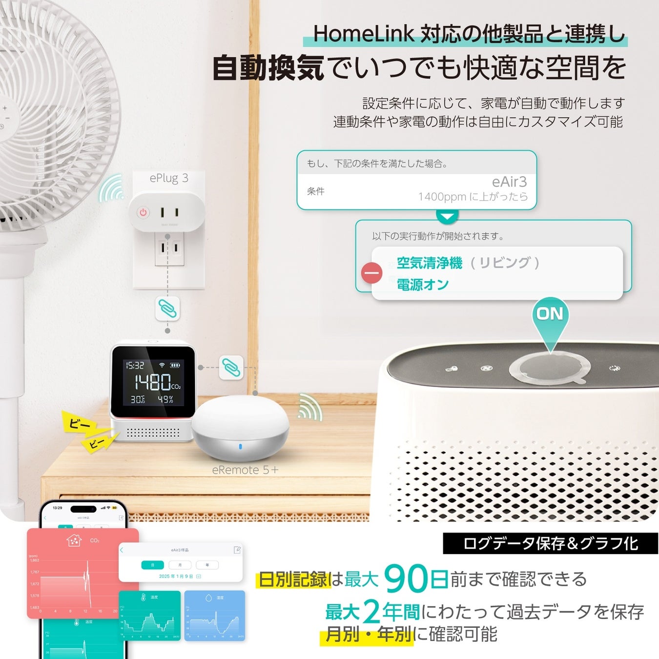 ユーザー数52万人超のスマートホーム統合アプリ「HomeLink」(ホームリンク)との連携機能も継承し、CO2濃度の計測値に応じて自動で換気扇やサーキュレーターをONにし、自動換気を行うスマート操作を可能にします。