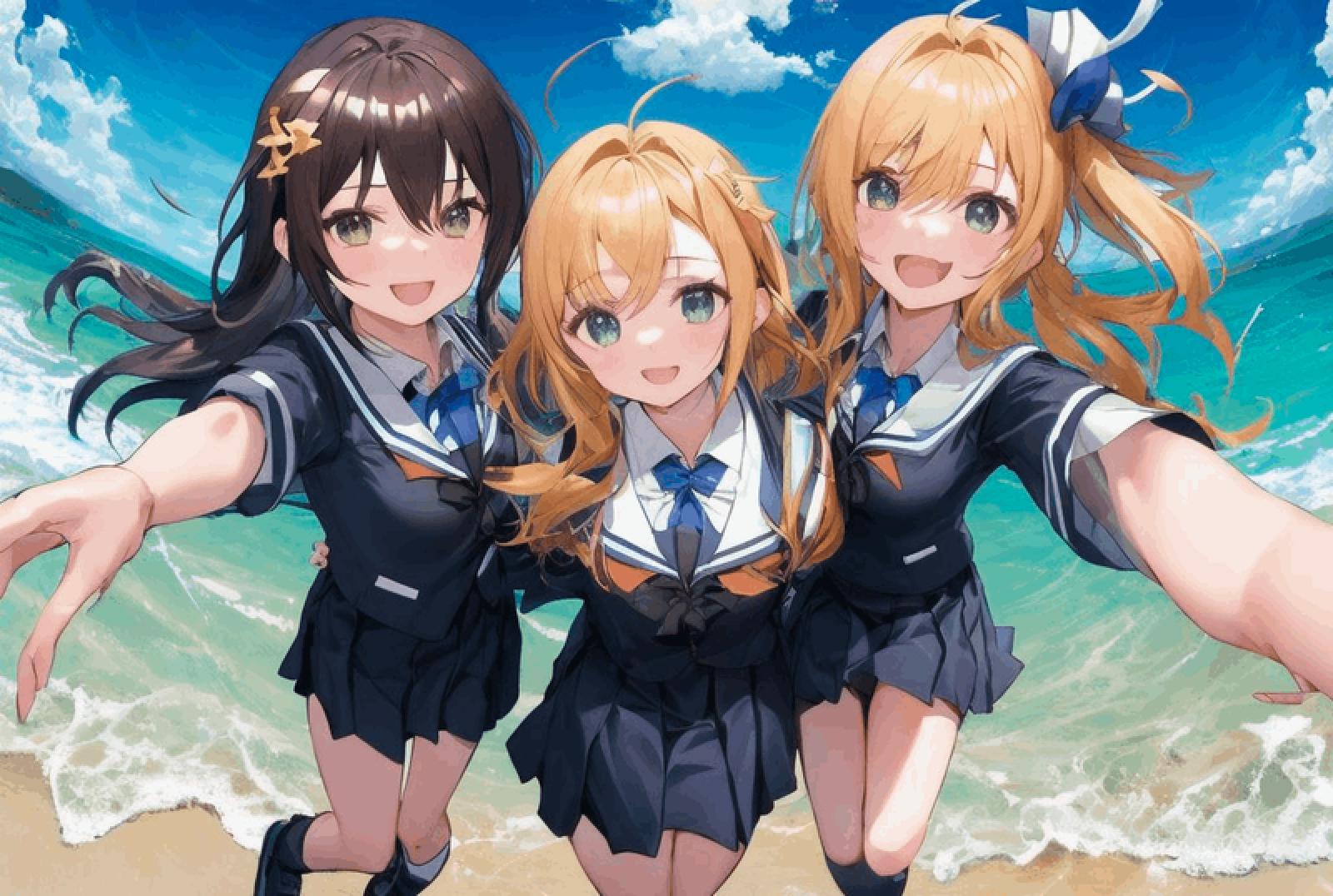 コツとしては距離が離れすぎると顔が崩れやすく、上半身だけだと青春感が薄くなるので自撮り風で上からの画角にする事で距離を保った状態で全身のイラストが作れる点です。