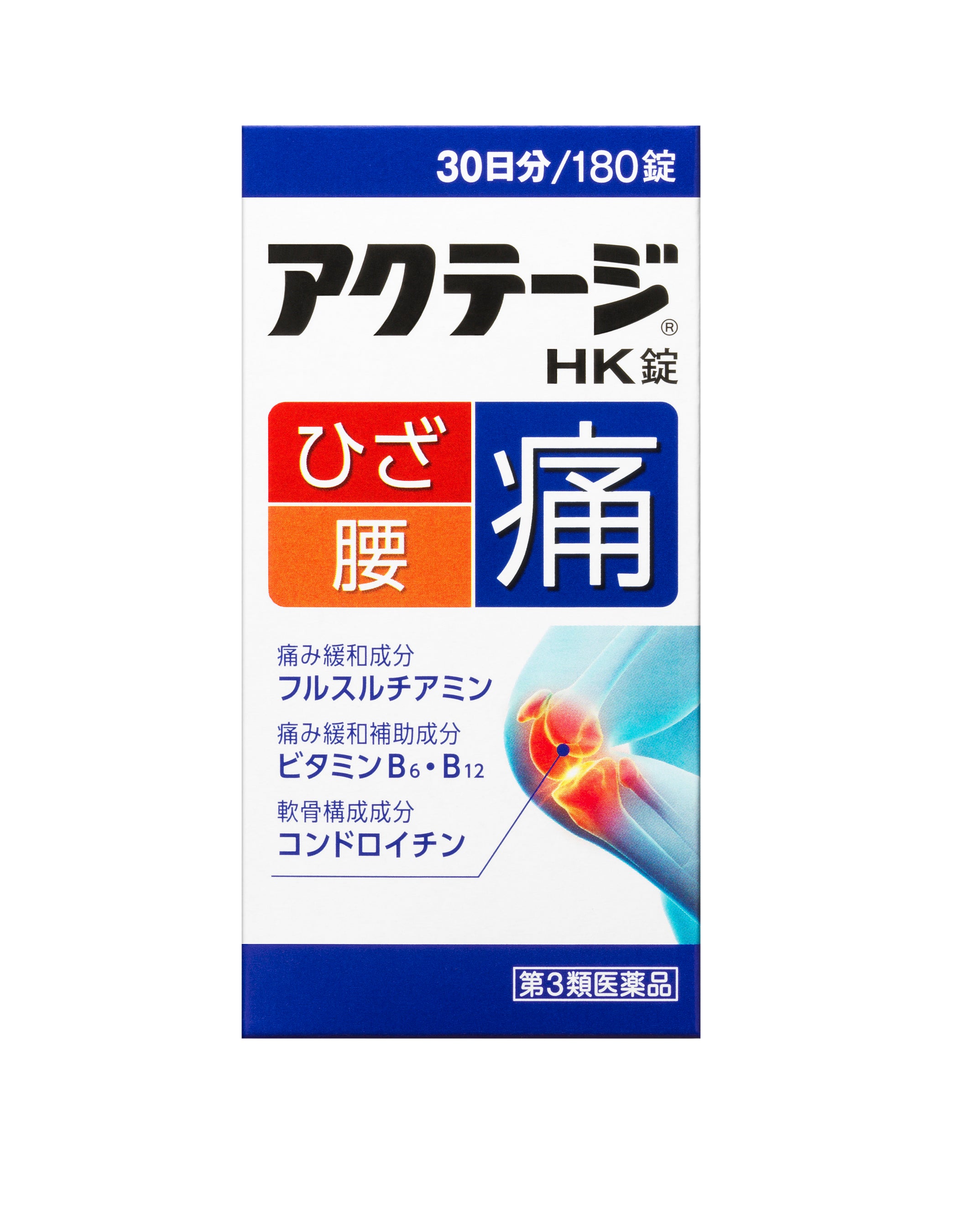 ● アクテージHK錠の有効成分は、吸収にすぐれたビタミンB1誘導体(フルスルチアミン)、コンドロイチン硫酸エステルナトリウム、ビタミンB6・B12で、ひざなどの関節痛や腰痛、神経痛に徐々に効果をあらわします。
