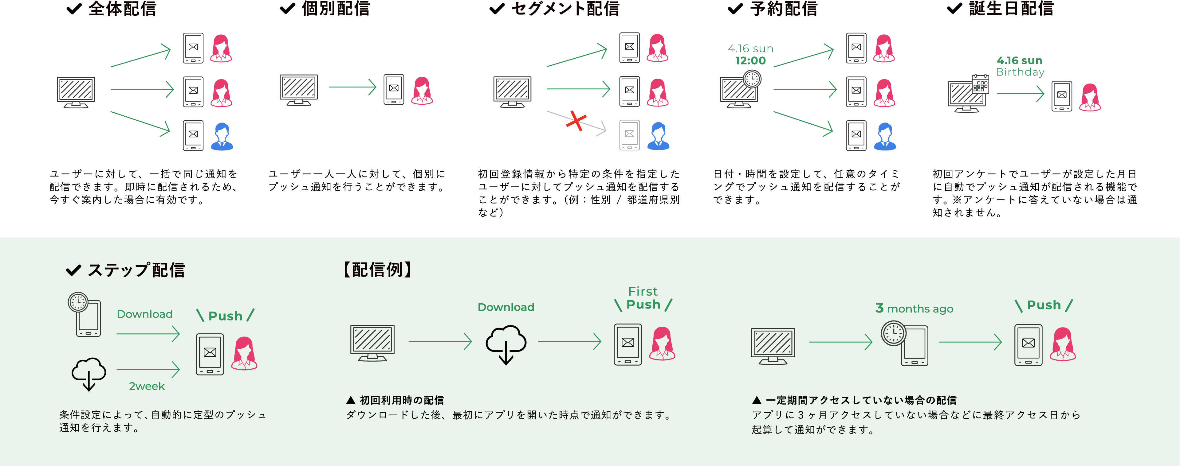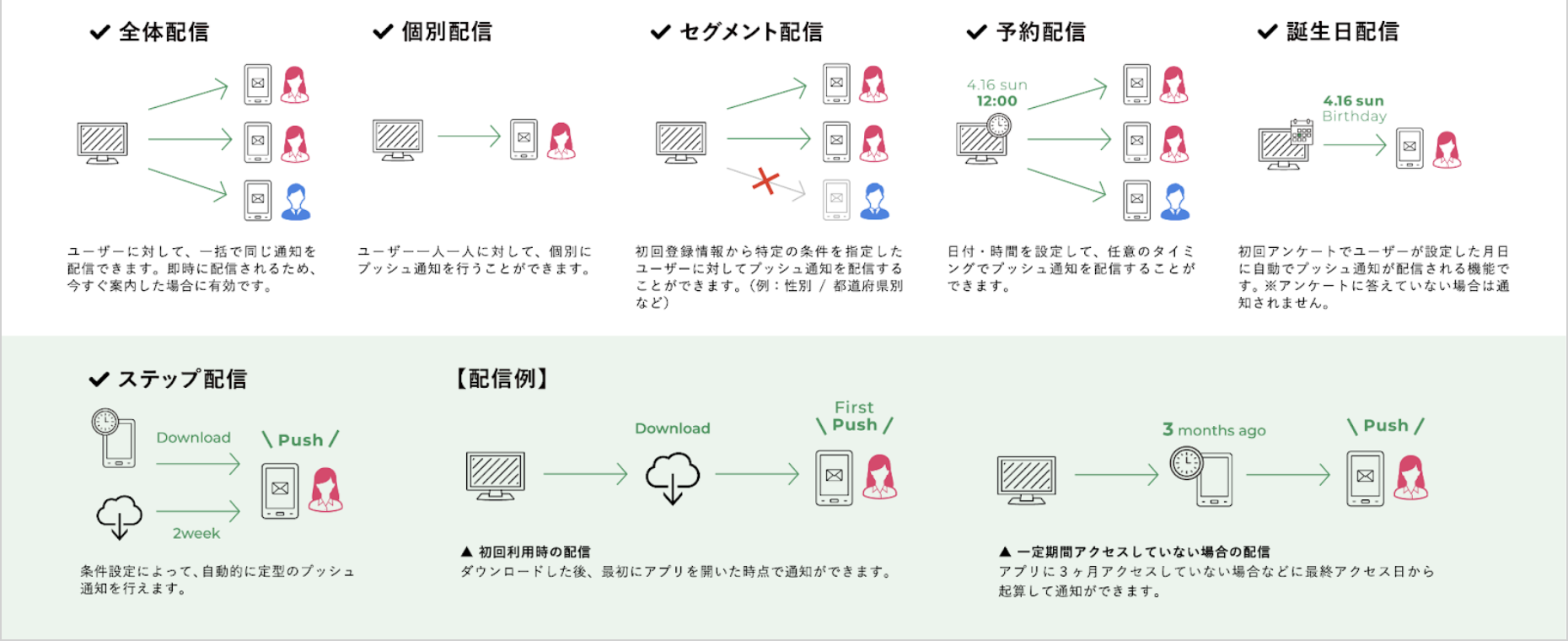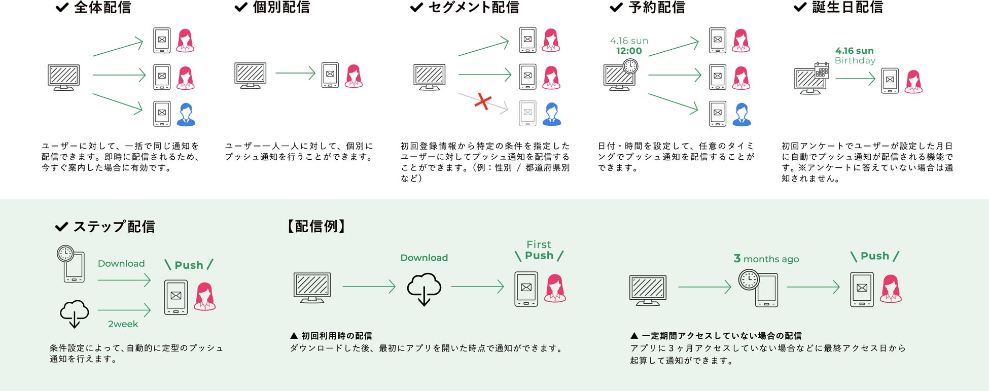全体配信はもちろん、ターゲットを絞ったセグメント配信や予約配信など、いろんなタイプのプッシュ通知を使うことで、必要なタイミングで、狙ったお客様にアプローチすることができます。