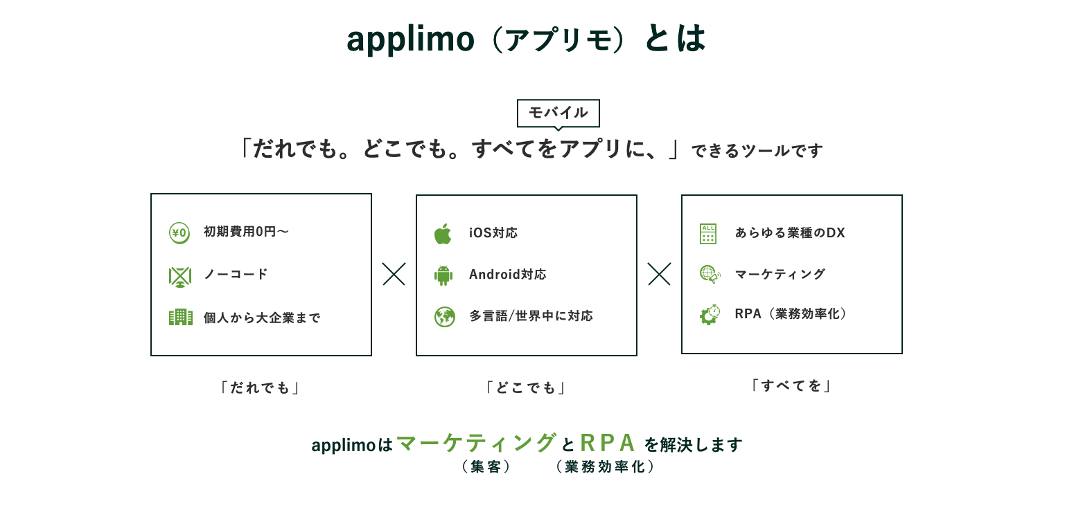アプリモではマーケティングとRPA、いわゆる集客と業務効率化を得意としています。