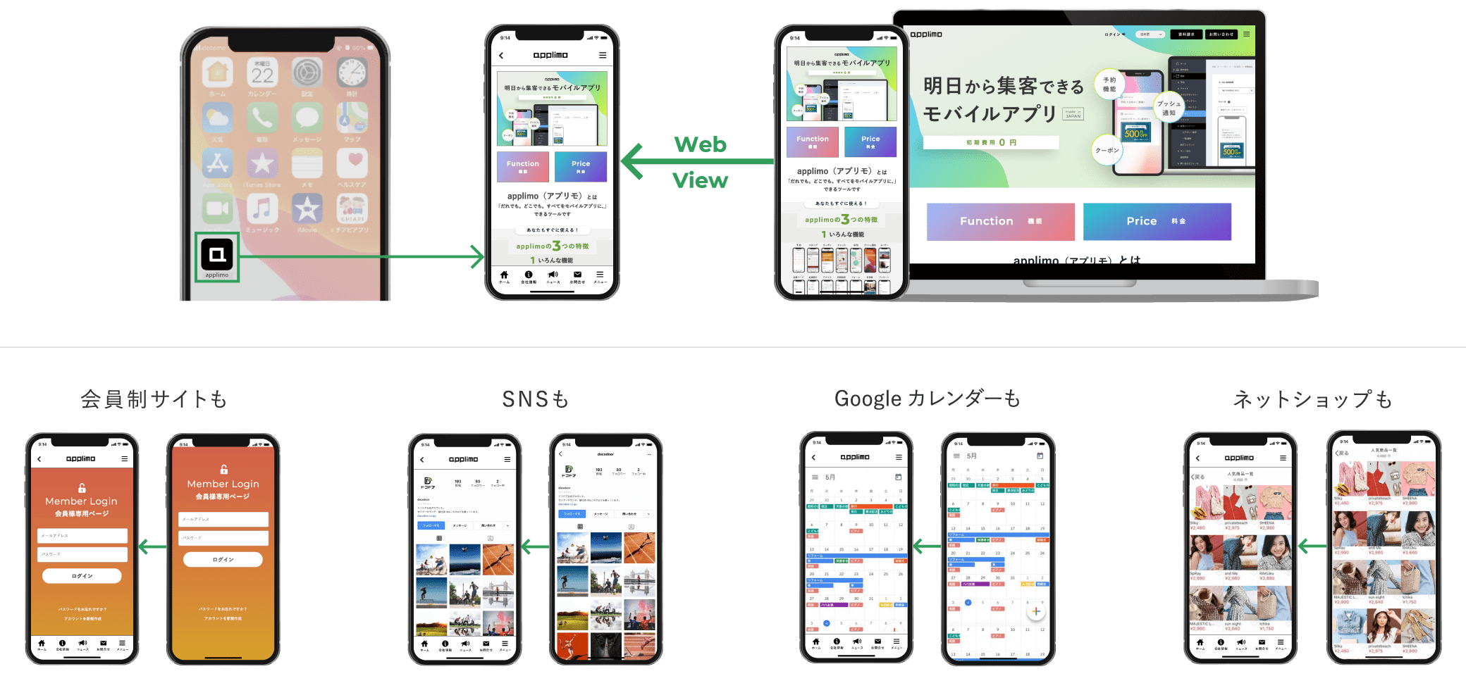 公式サイトではアプリ導入を検討しサイトを訪れた全ての方々に向けた価値提供を実現するため、様々な業種・業態における「アプリモ活用シーン」のご提案や実際に導入いただいている「導入事例」を掲載しております。