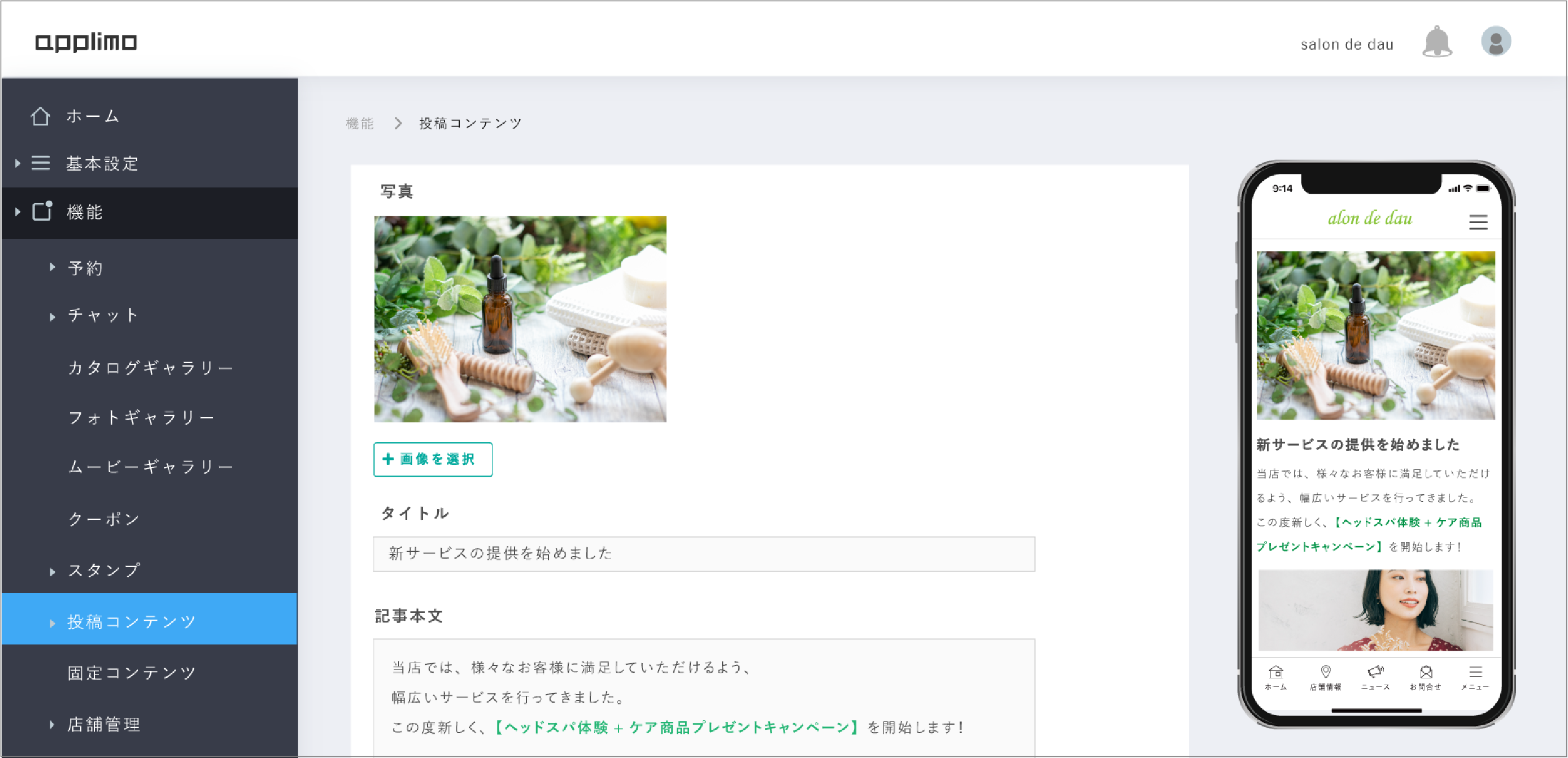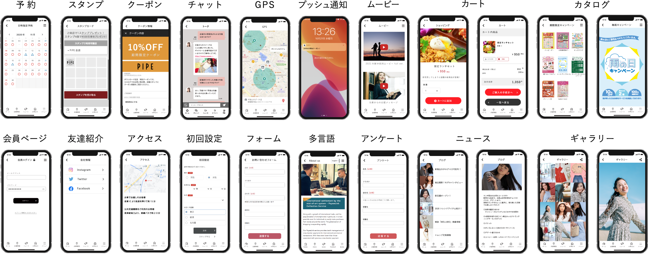 アプリモによって、プッシュ通知やクーポン、スタンプなどによるマーケティング強化や、ファイルや動画によるノウハウの共有、チャットやネット予約などによるRPA、いわゆる業務効率化を進めることができます。