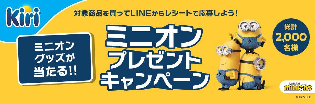 ミニオンのグッズが当たるプレゼントキャンペーンを2024年7月19日(金)〜12月25日(水)の期間で実施いたします。対象の「キリ」商品を購入したレシートを撮影し、ミニオン限定パッケージに記載のQRコードまたは「キリ」LINEアカウント(@921gqgxq)を通じて応募すると、抽選で合計2,000名様にミニオンのグッズが当たります。