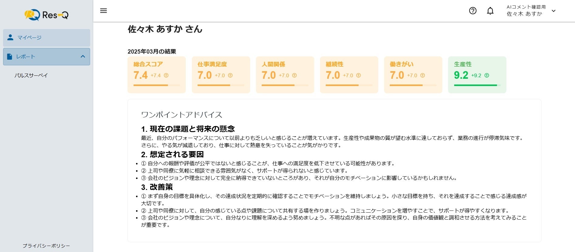 サーベイ結果はダッシュボード上で確認でき、経営層や人事担当者が組織の状況を視覚的に把握することができます。