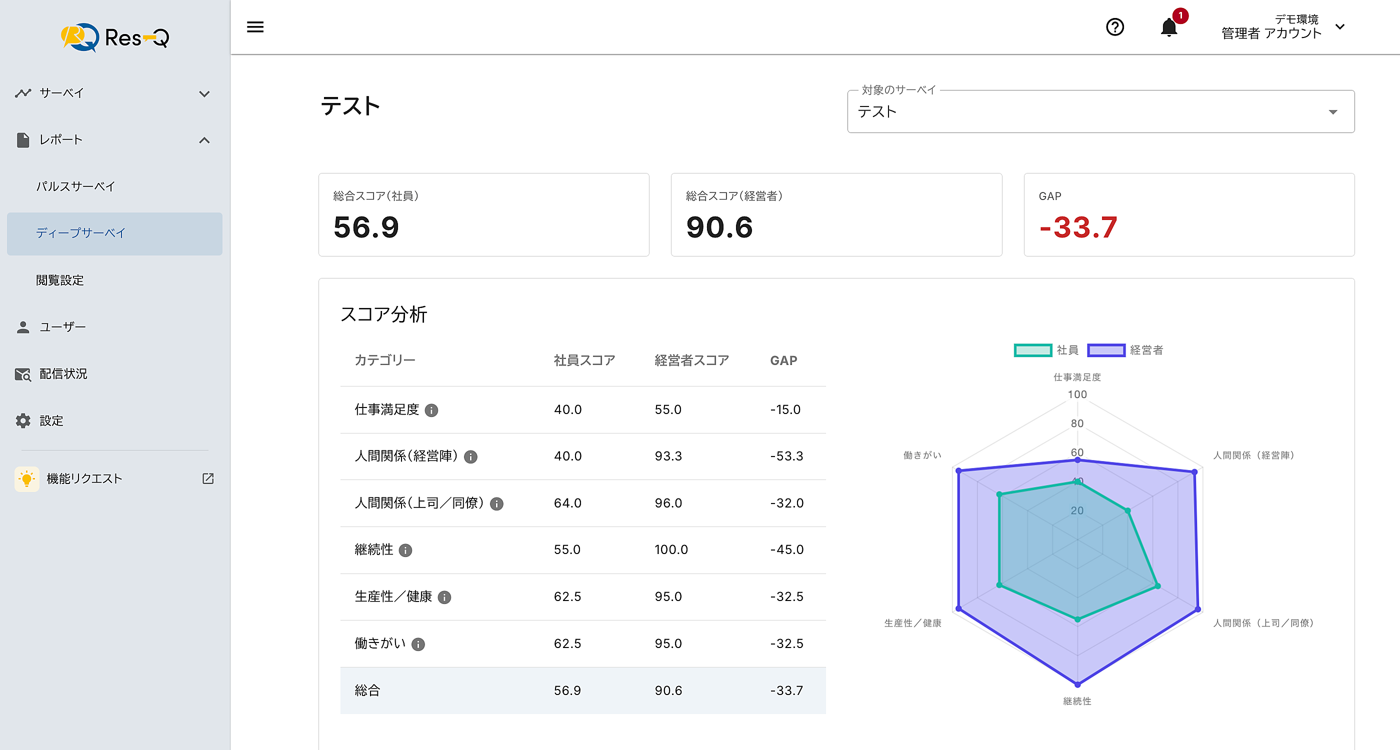 今回のリニューアルでは、経営層と非経営層それぞれの回答結果を比較することで、組織内の認識ギャップを可視化する「ディープサーベイ」機能を強化しています。