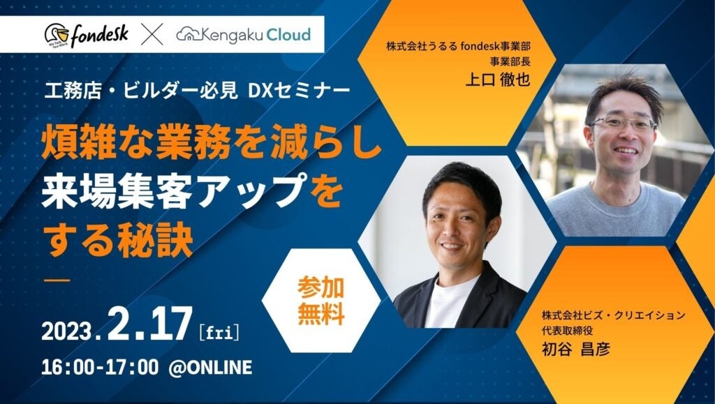 「忙しくてなかなか集客アップに取り組めていない」「イベントを行いたいが、人員が足りていない」など集客アップを行いたくてもできないお悩みは、住宅会社様からよくお聞きします。今回は、スムーズな電話取次によるDX、人員不足を解消する「fondesk」運営の株式会社うるるfondesk事業部長上口氏をお招きし、工務店の人員不足解消、DXによる集客アップについてお話しいたします。業務効率化によってより有効な施策に時間を割き、集客アップ・成約アップを実現している住宅会社様がいらっしゃいます。今回のセミナーでは具体的なサービス活用方法お伝えします。工務店経営者、工務店集客担当者の方は、無料でオンライン参加することができます。