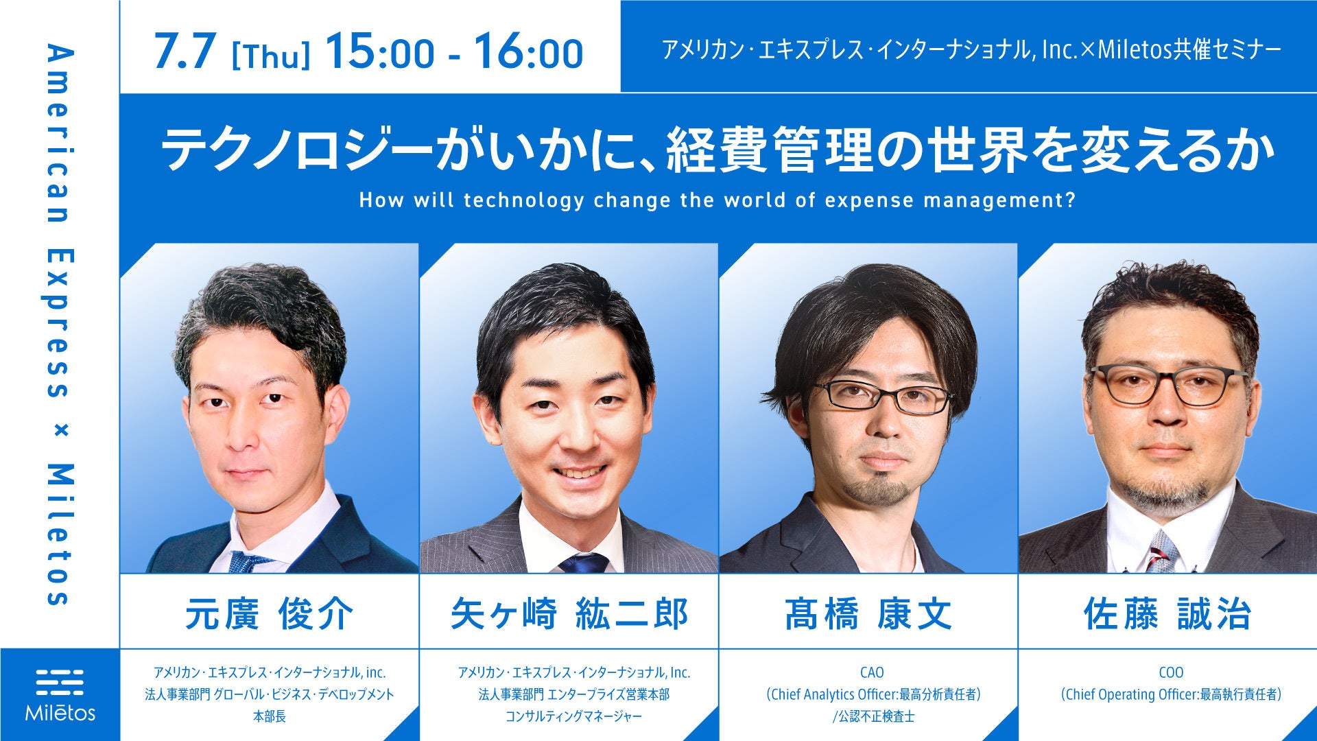 Miletos株式会社(本社:東京都中央区、代表取締役社長 兼 CEO:朝賀 拓視、代表取締役 兼 CTO/CPO:平野 将章)は、アメリカン・エキスプレス・インターナショナル, Inc.(本社:東京都港区、日本社長:吉本 浩之 氏)と、オンラインセミナー『テクノロジーがいかに、経費管理の世界を変えるか』を7月7日(木)に開催します。