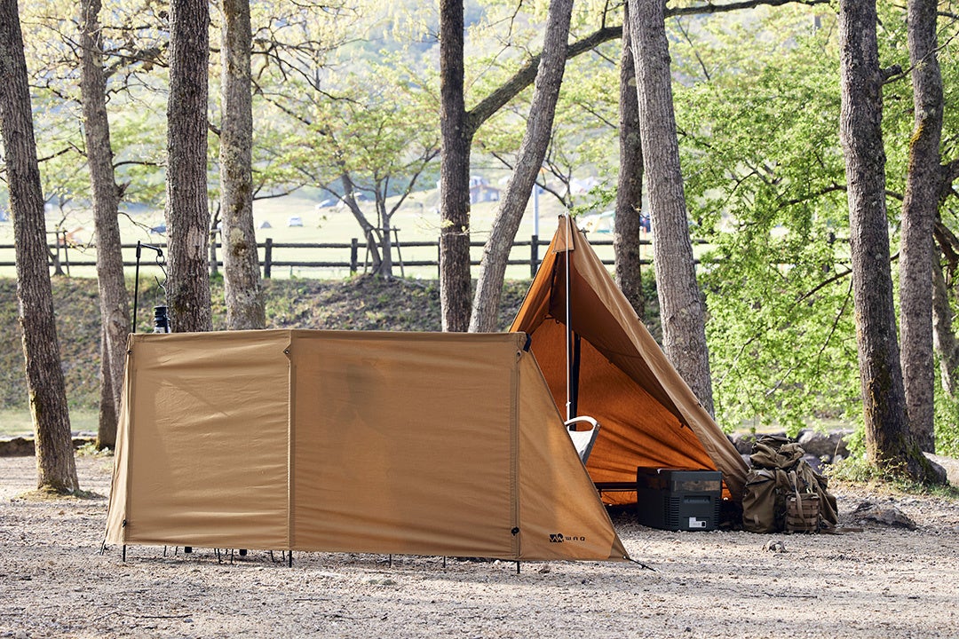 本製品はソロキャンプのプライベート性を高めより快適に楽しめる1-2人用陣幕。生地にはAlpha TCと同じコットンと高い遮光性と通気性を兼ね備えてたポリエステルのTC素材を採用。ランタンフレームやハンガーフレームも標準装備。また、アイアンフレームを採用し剛性を高め、お好みの角度に調整可能なアレンジ性能も兼ね備えた、快適な1人だけの空間を作ることが可能な製品です。