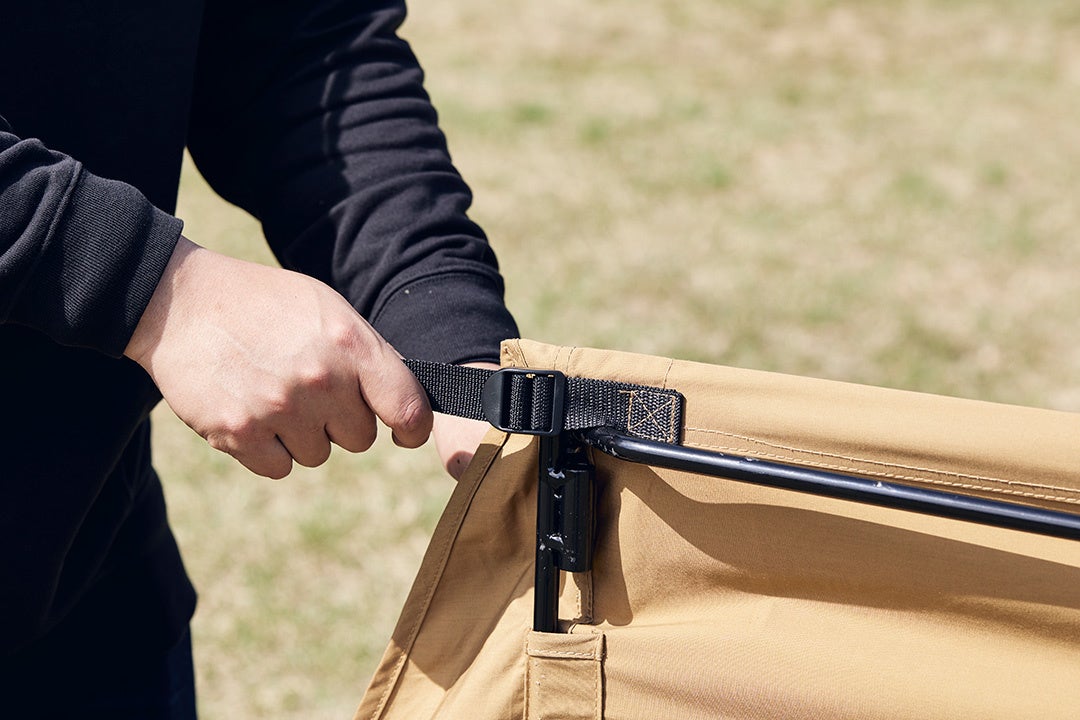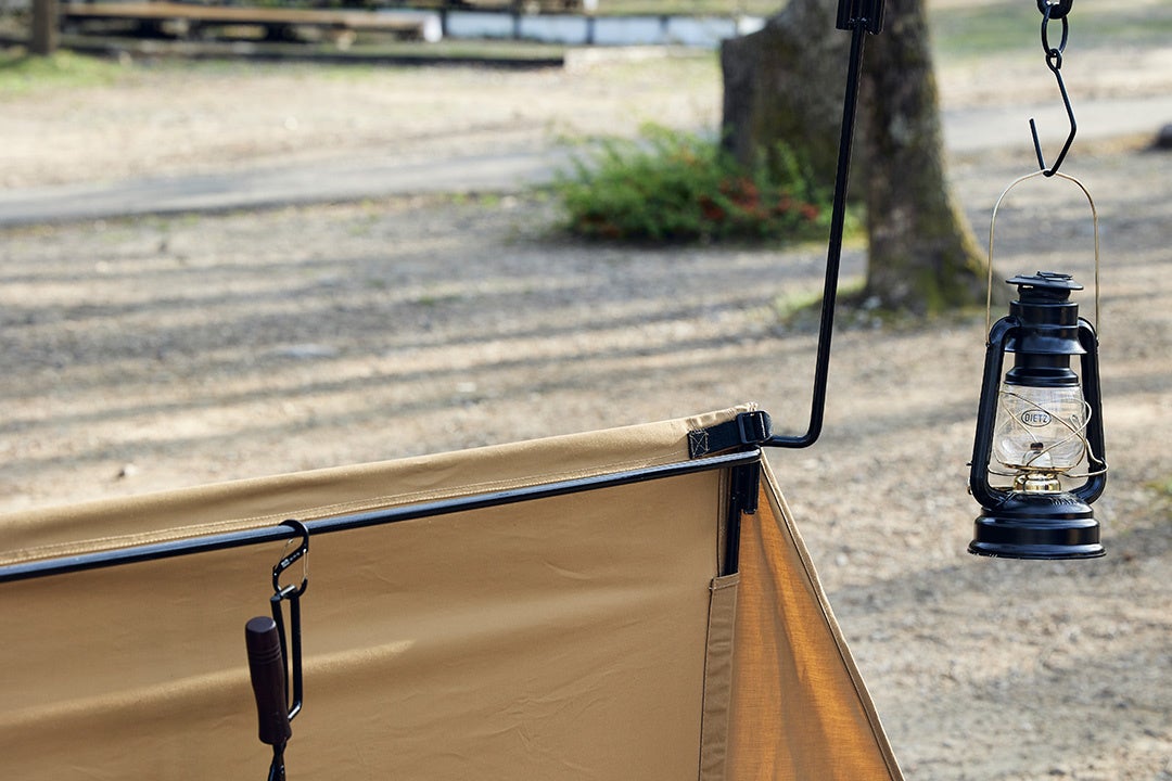 ハンガーフレーム構造のため、調理器具などのアイテムをフレームに引っ掛けることが可能に。また、標準でランタンハンガーも付属しており、灯りの確保も簡単にできます。